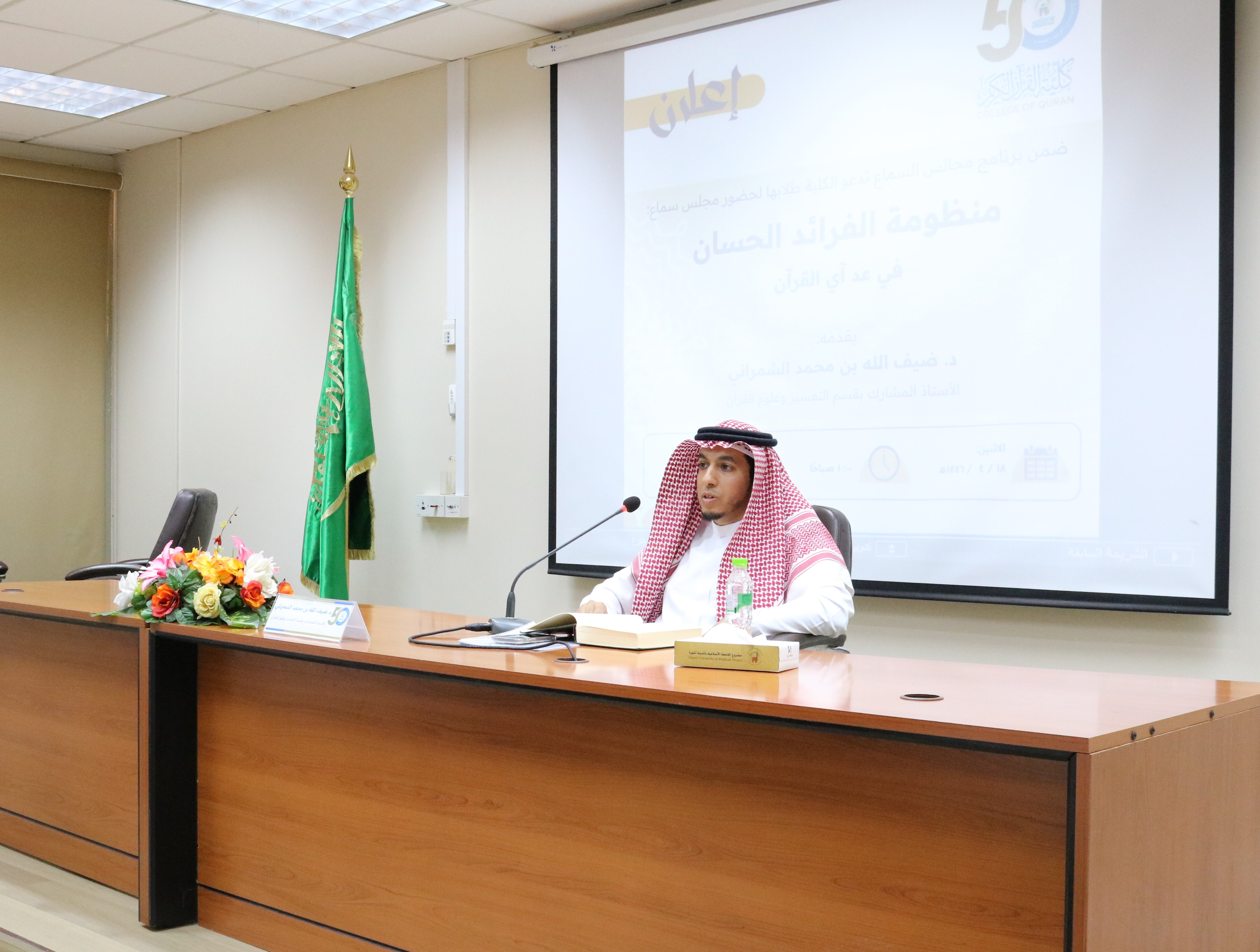 أقامت كلية القران الكريم ضمن برنامج مجالس السماع مجلس سماع بعنوان: منظومة الفرائد الحسان في عد آي القرآن، في يوم الاثنين الموافق 18 / 4 / 1446هـ، في تمام الساعة 10 صباحًا، بقاعة المناقشات بالكلية، وقد ألقاها فضيلة د. ضيف الله بن محمد الشمراني الأستاذ المشارك بقسم التفسير وعلوم القرآن، وحضر اللقاء عدد من طلاب الكلية.