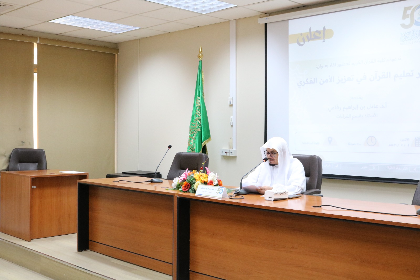 أقامت كلية القران الكريم لقاءً بعنوان: أثر تعليم القرآن في تعزيز الأمن الفكري، في يوم الاثنين الموافق 4 / 4 / 1446هـ، في تمام الساعة 10 صباحًا، بقاعة المناقشات بالكلية، وقد ألقاها فضيلة أ.د. عادل بن إبراهيم رفاعي، الأستاذ بقسم القراءات، وحضر اللقاء عدد من طلاب الكلية.
