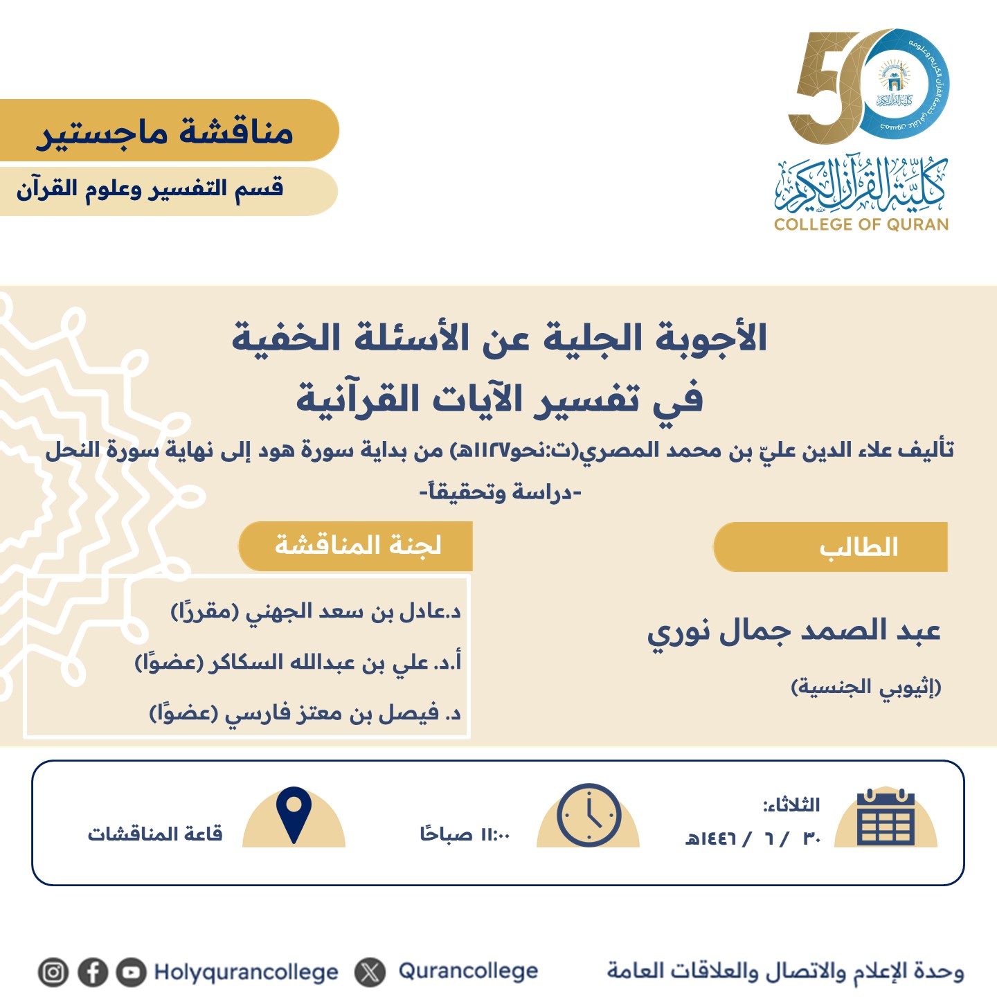 دعوة لحضور مناقشة الماجستير بعنوان: