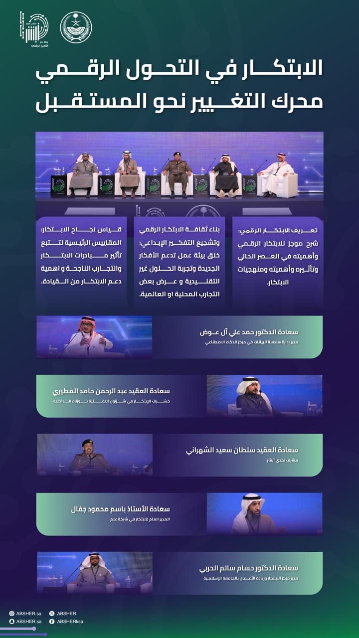 كما شهد الملتقى مشاركة خبراء متخصصين من الهيئة الوطنية للأمن السيبراني وسدايا و جامعة نايف العربية للعلوم الأمنية وشركة علم وتم خلال الملتقى تنظيم عدة ورش عمل وجلسات علمية، منها: “الابتكار في التحول الرقمي: محرك التغيير نحو المستقبل"، و"القيادة الرقمية في عصر التكنولوجيا والبيانات"، و"سباق الذكاء الاصطناعي العالمي". كما استعرض الملتقى منجزات وزارة الداخلية وإمارات المناطق في التحول الرقمي، إلى جانب التوجهات التقنية الحديثة ودورها في تحقيق رؤية السعودية 2030.
