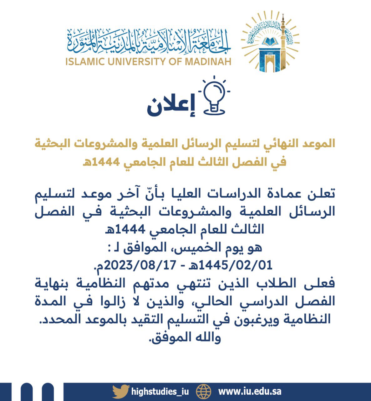 الموعد النهائي لتسليم الرسائل والمشروعات البحثية في الفصل الثالث للعام الجامعي 1444هـ