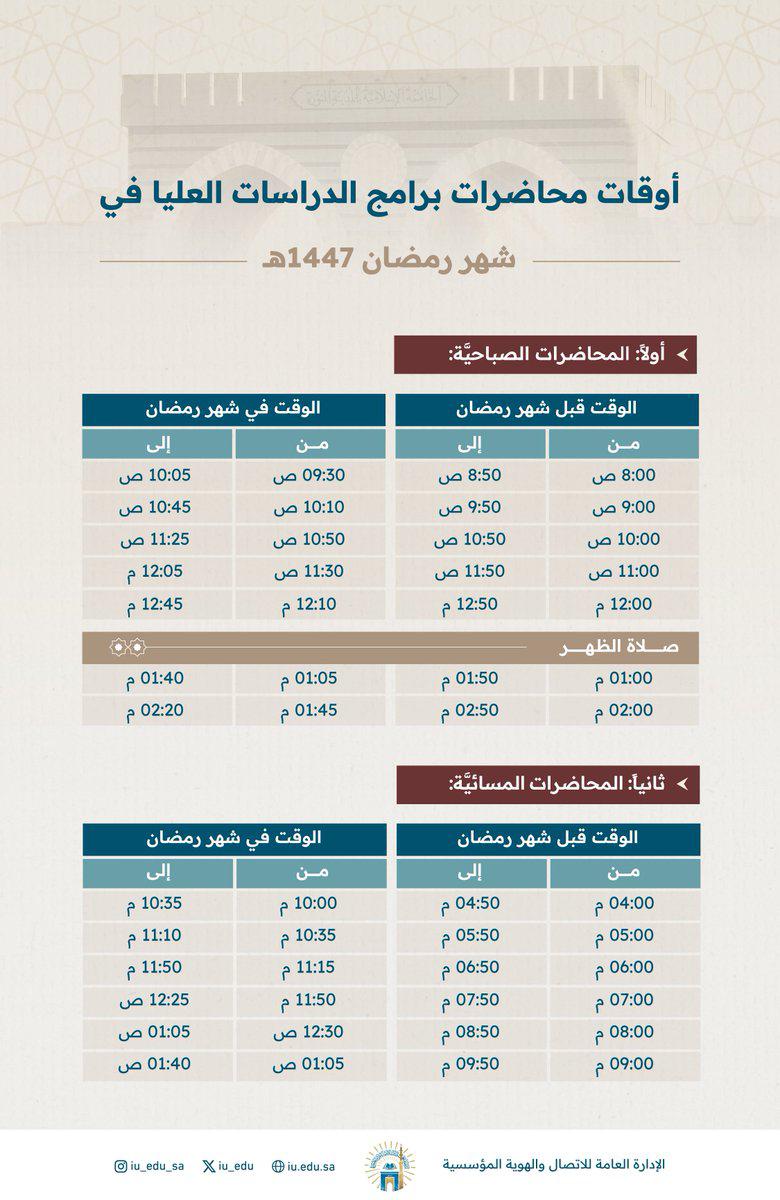 أوقات محاضرات برامج الدراسات العليا في شهر رمضان المبارك 1447هـ