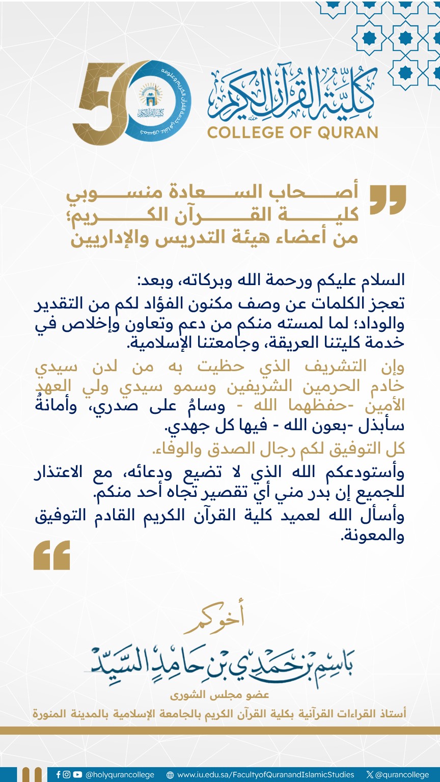 أ.د. باسم بن حمدي السيد يشكر منسوبي كلية القرآن الكريم من أعضاء هيئة التدريس والإداريين