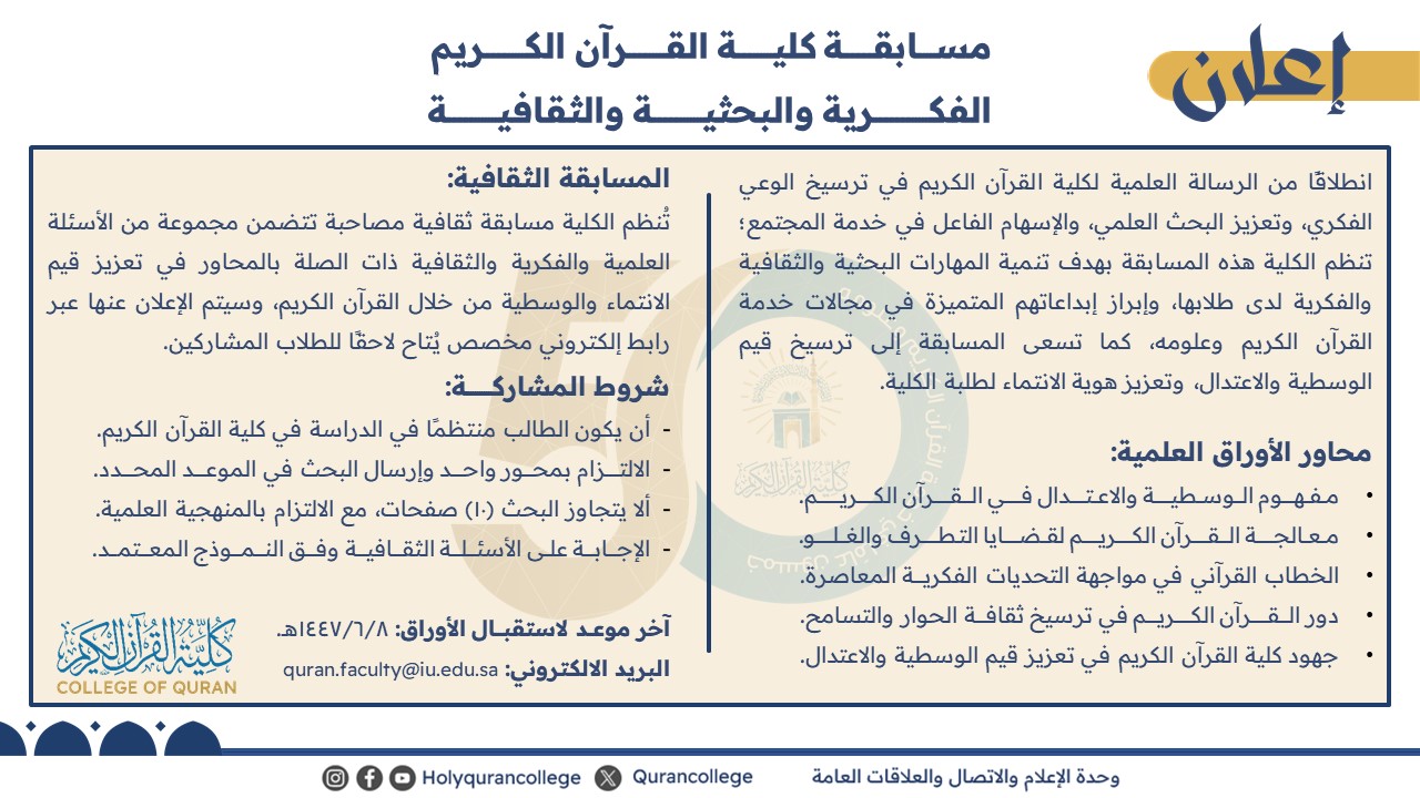 بالتعاون مع وحدة التوعية الفكرية اختتمت كلية القرآن الكريم مسابقة طلابية في التوعية الفكرية وتكريم الفائزين