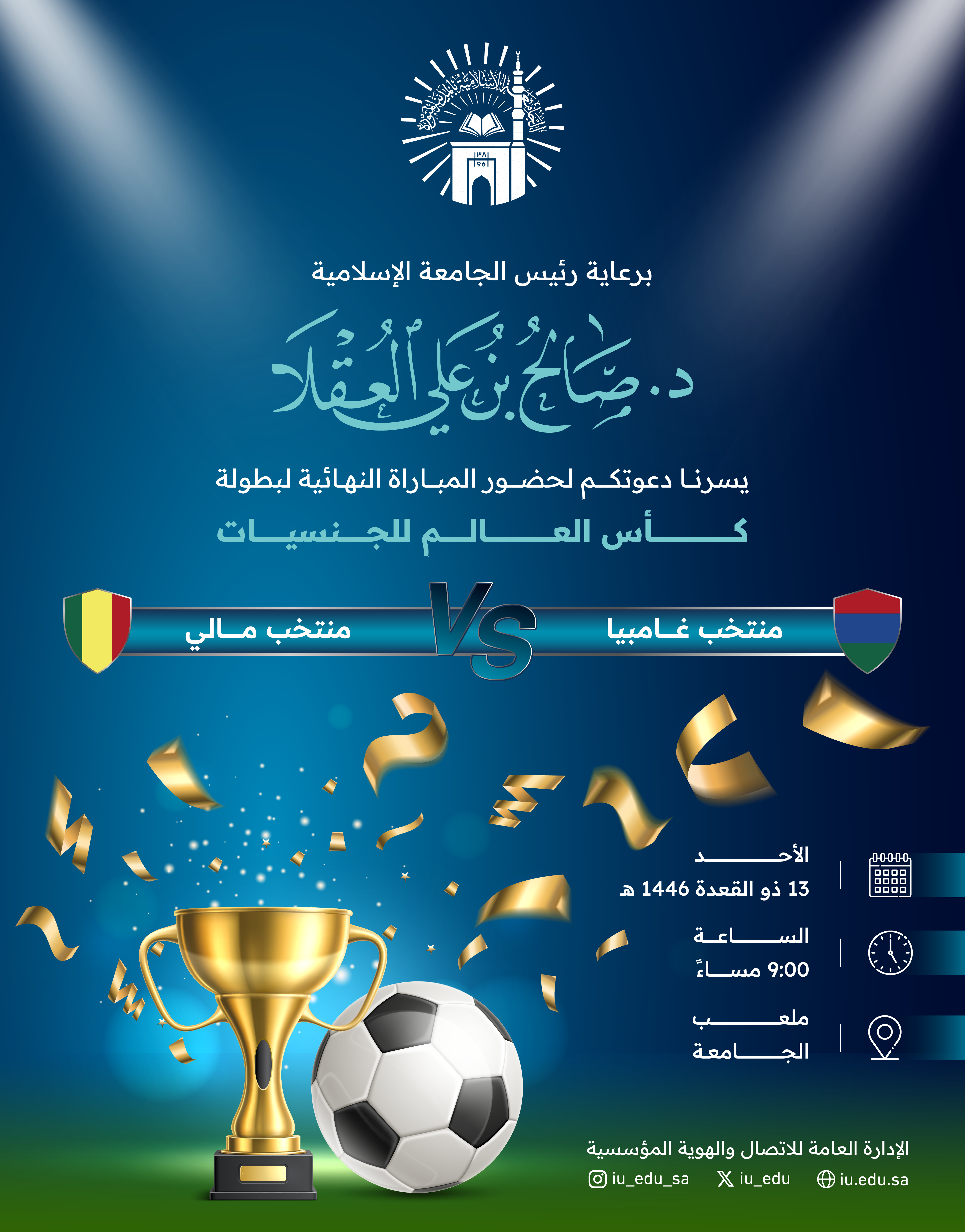 للجنسيات، وذلك يوم الأحد 13 ذو القعدة 1446هـ، بملعب الجامعة، 9:00 مساءً.