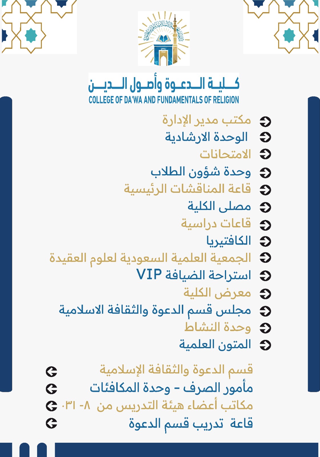 بالتزامن مع #أسبوع_الجودة_السابع قامت إدارة #كلية_الدعوة_وأصول_الدين بتحديث الهوية البصرية لجميع اللوحات الإرشادية والتوجيهية داخل الكلية