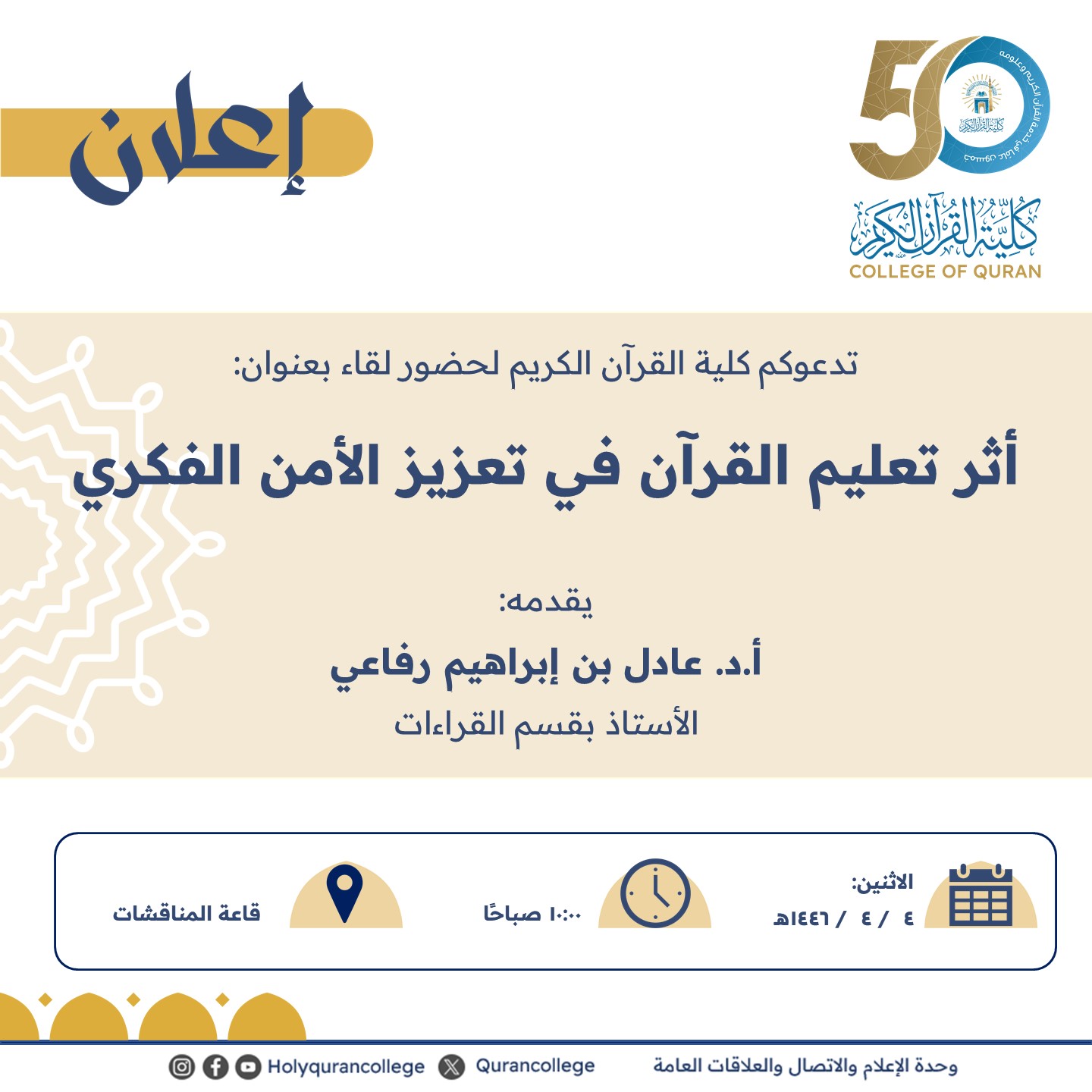 تدعوكم كلية القرآن الكريم لحضور لقاء بعنوان: أثر تعليم القرآن في تعزيز الأمن الفكري