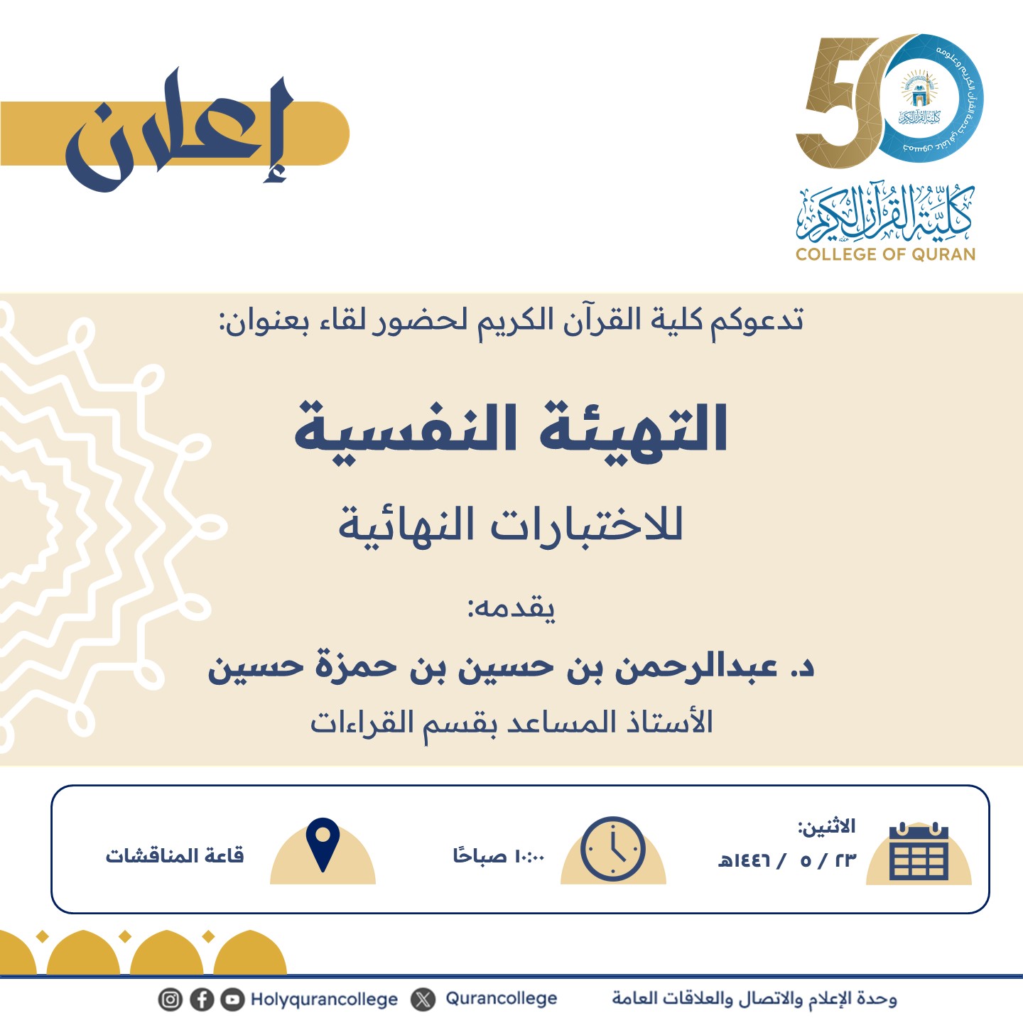 تدعوكم كلية القرآن الكريم لحضور لقاء بعنوان: التهيئة النفسية للاختبارات النهائية