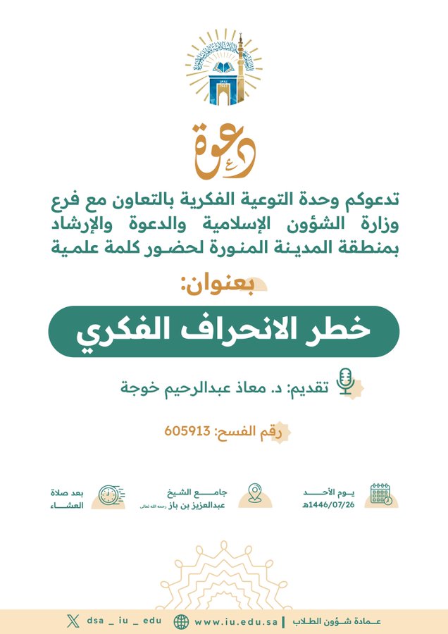 تدعوكم وحدة التوعية الفكرية بالتعاون مع فرع وزارة الشؤون الإسلامية والدعوة والإرشاد بمنطقة المدينة المنورة لحضور كلمة علمية بعنوان: "خطر الانحراف الفكري" تقديم: فضيلة الدكتور/ معاذ عبدالرحيم خوجة يوم الأحد 26-07-1446 بعد صلاة العشاء بجامع الشيخ ابن باز