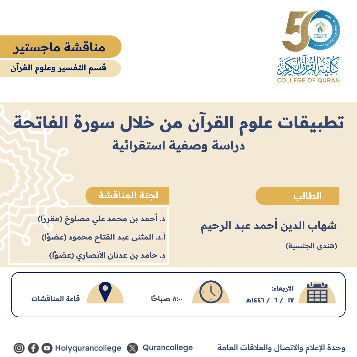 دعوة لحضور مناقشة الماجستير بعنوان: