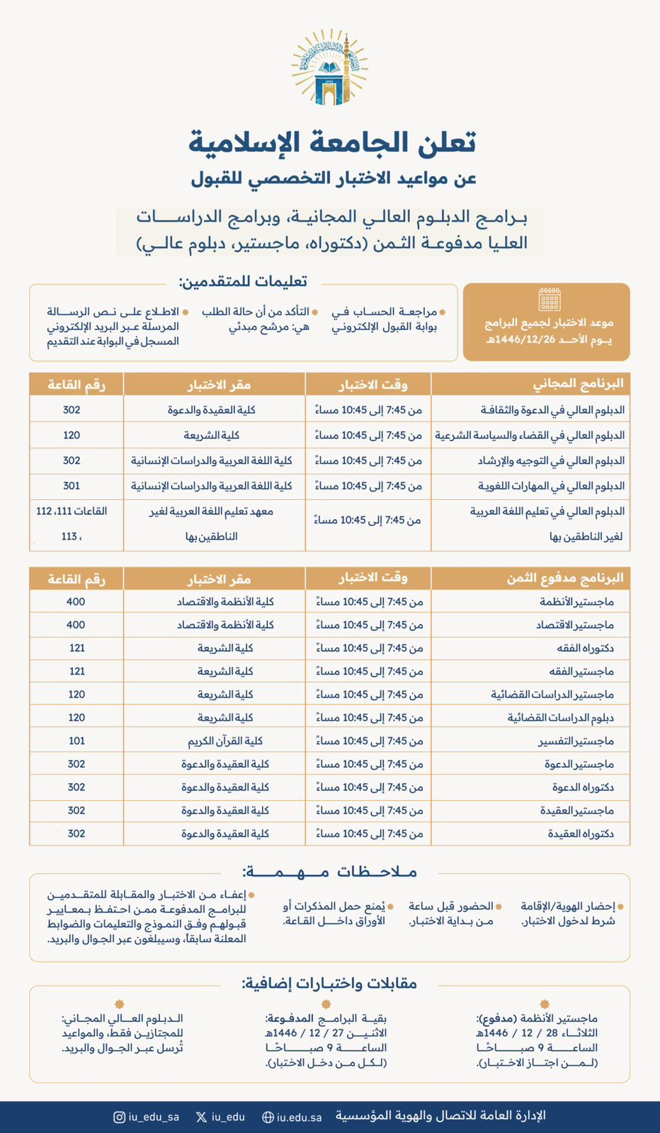 تعلن الجامعة الإسلامية عن مواعيد الاختبار التخصصي للقبول في برامج الدبلوم العالي المجانية، وبرامج الدراسات العليا مدفوعة الثمن (دكتوراه، ماجستير، دبلوم عالي).