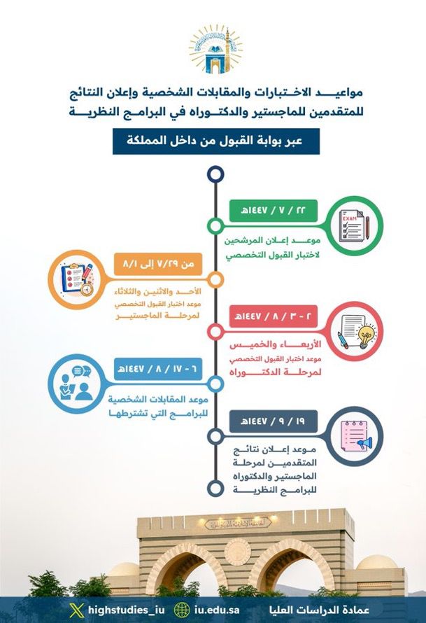 تعلن الجامعة الإسلامية ممثلةً بعمادة الدراسات العليا مواعيد الاختبارات، والمقابلات الشخصية، وإعلان النتائج لبرامج الماجستير والدكتوراه في المسار النظري