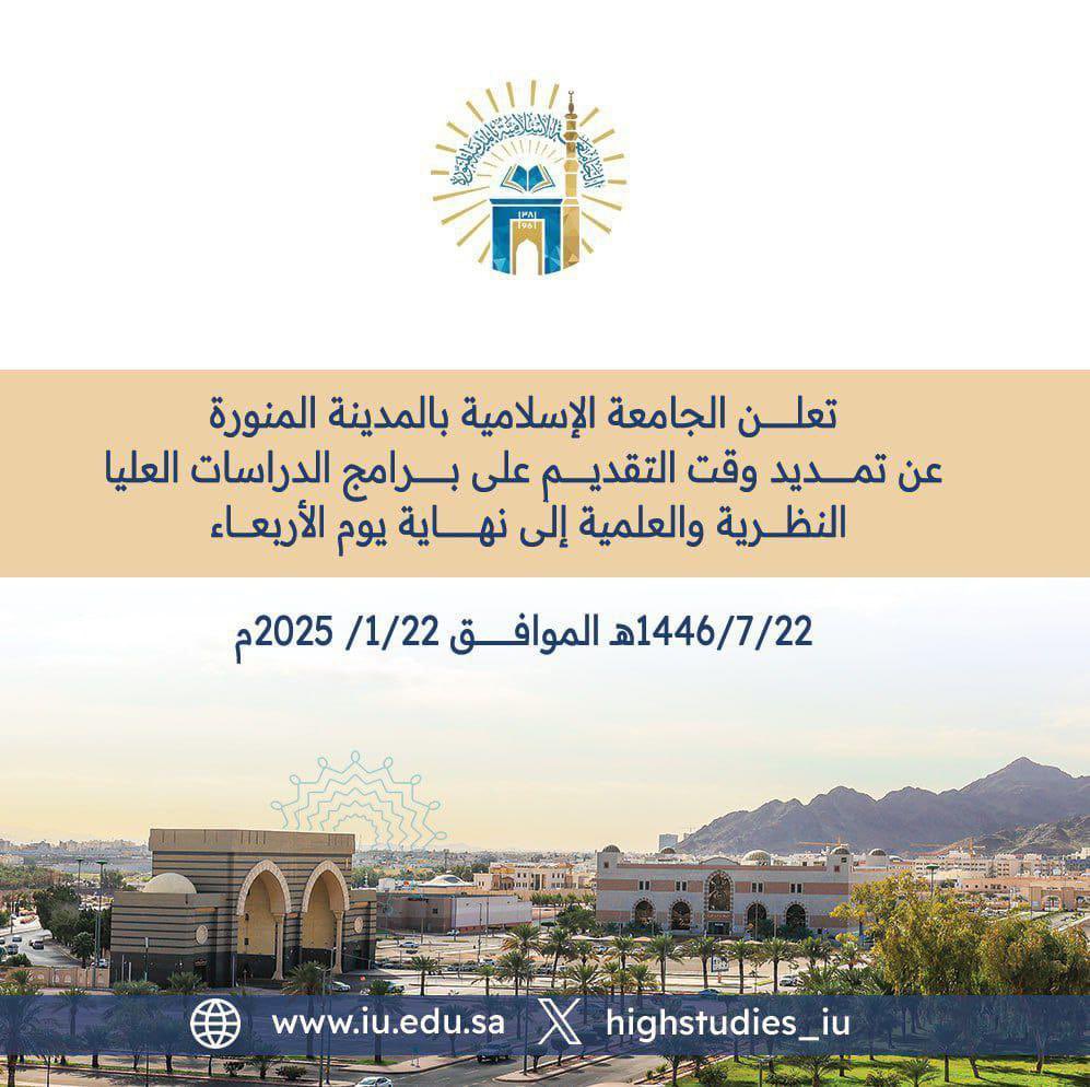 تعلن #الجامعة_الإسلامية عن تمديد فترة التقديم على برامج الدراسات العليا النظرية والعلمية للعام الجامعي 1447هـ، حتى نهاية يوم الأربعاء 22 / 7 / 1446هـ، الموافق 22 / 1 / 2025م.