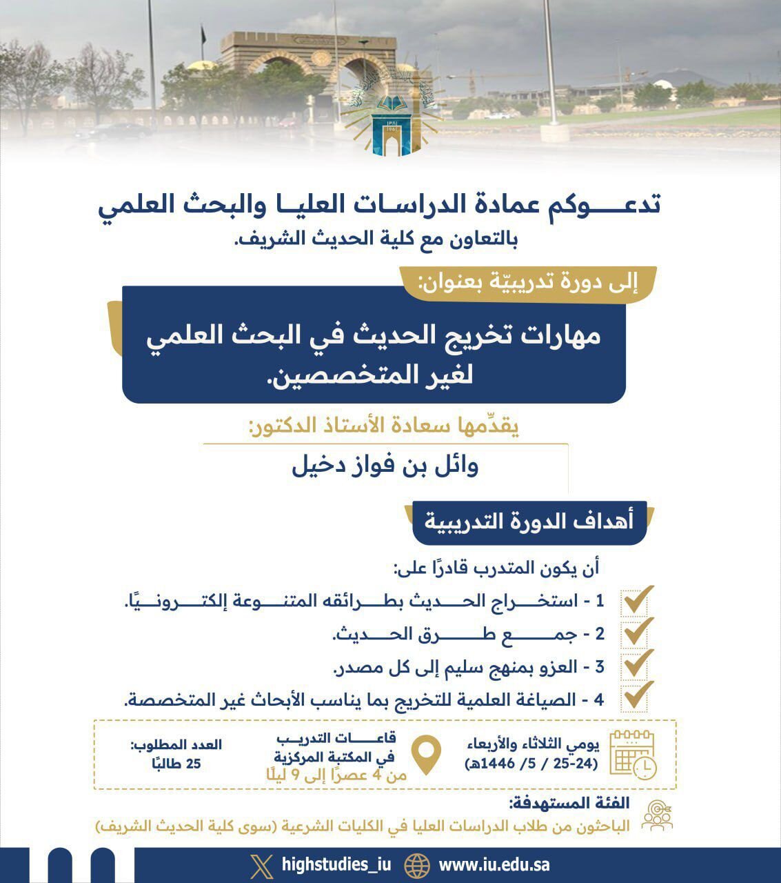 تعلن #عمادة_الدراسات_العليا_والبحث_العلمي بالتعاون مع #كلية_الحديث_الشريف عن تقديم دورة تدريبية بعنوان (مهارات تخريج الحديث في البحث العلمي لغير المتخصصين)