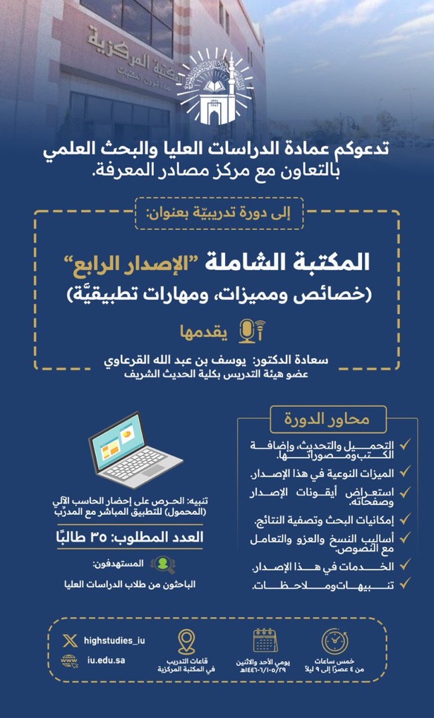 تعلن #عمادة_الدراسات_العليا_والبحث_العلمي بالتعاون مع #مركز_مصادر_المعرفة عن تقديم دورة تدريبية بعنوان (المكتبة الشاملة [4] خصائص ومميزات، ومهارات تطبيقيّة)