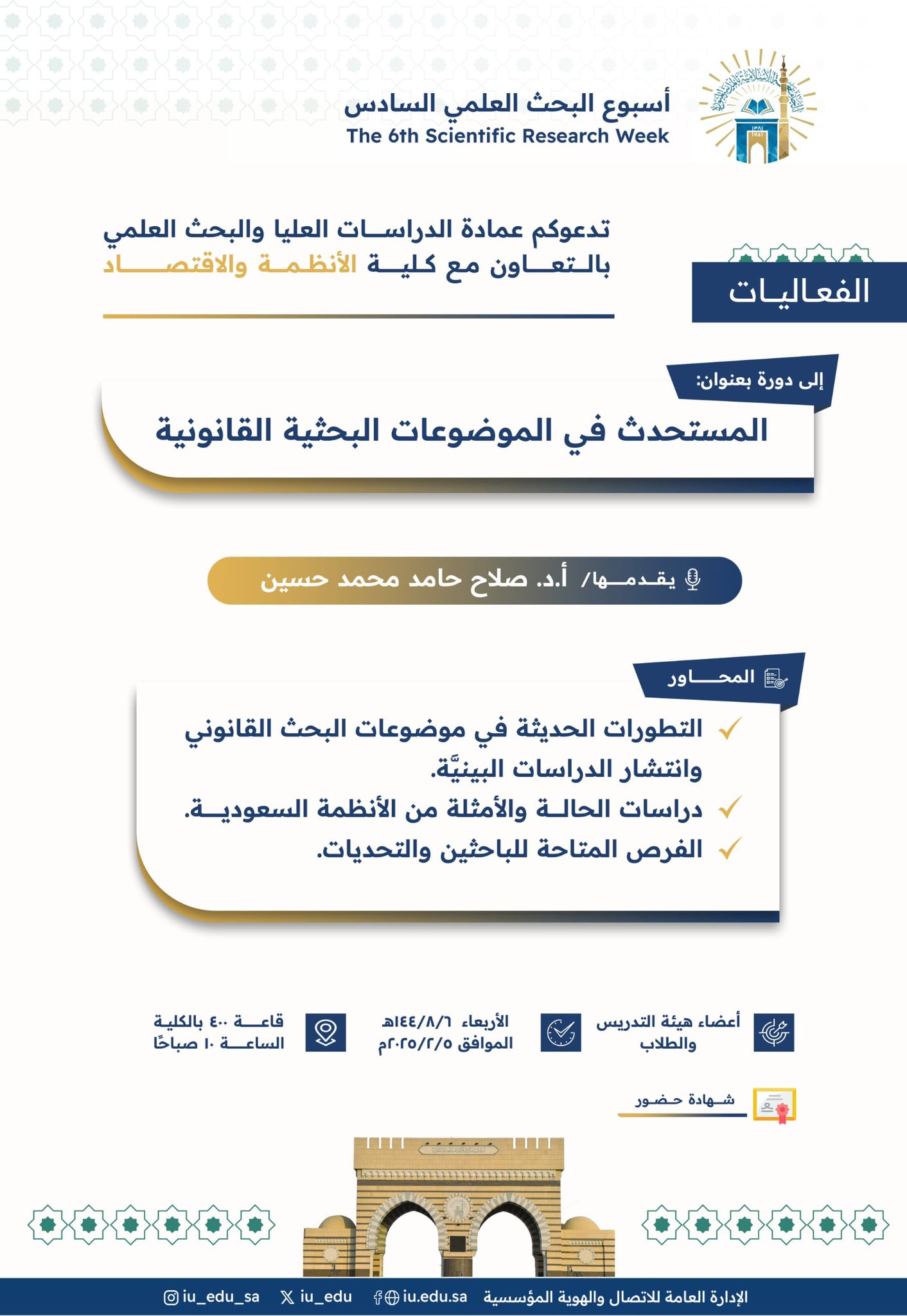 تعلن عمادة_الدراسات_العليا_والبحث_العلمي بالتعاون مع #كلية_الأنظمة_والاقتصاد - ضمن #أسبوع_البحث_العلمي السادس عن تقديم دورة تدريبيّة يقدِّمها سعادة الأستاذ الدكتور صلاح حامد محمّد حسين