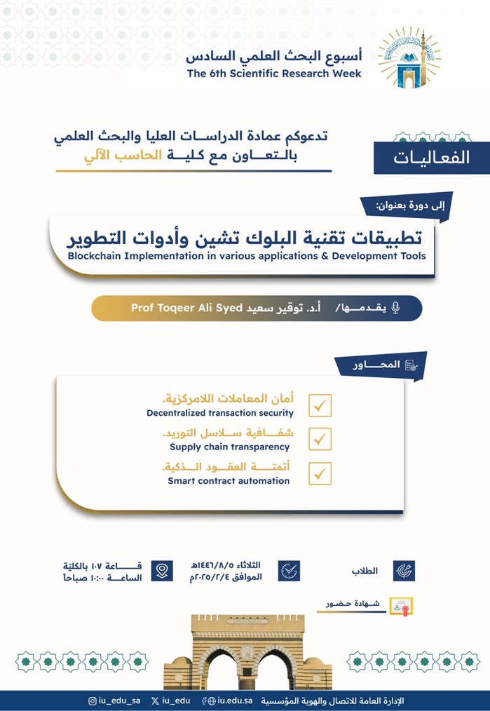 تعلن عمادة_الدراسات_العليا_والبحث_العلمي بالتعاون مع #كلية_الحاسب_الآلي - ضمن #أسبوع_البحث_العلمي السادس- عن تقديم دورة تدريبيّة يقدِّمها سعادة الأستاذ الدكتور توقير سعيد
