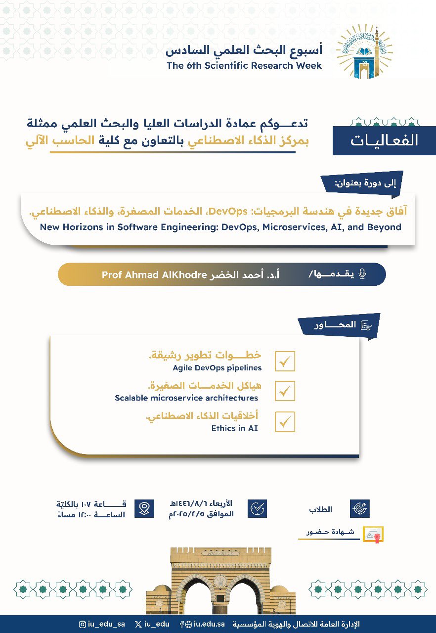 تعلن عمادة_الدراسات_العليا_والبحث_العلمي ممثلة بـ مركز_الذكاء_الاصطناعي بالتعاون مع #كلية_الحاسب_الآلي - ضمن #أسبوع_البحث_العلمي السادس- عن تقديم دورة تدريبيّة يقدِّمها سعادة الأستاذ الدكتور أحمد الخضر