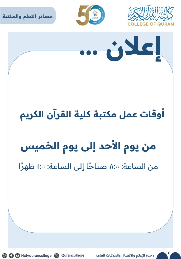 تعلن كلية القرآن الكريم عن المواعيد الرسمية لأوقات عمل مكتبة الكلية