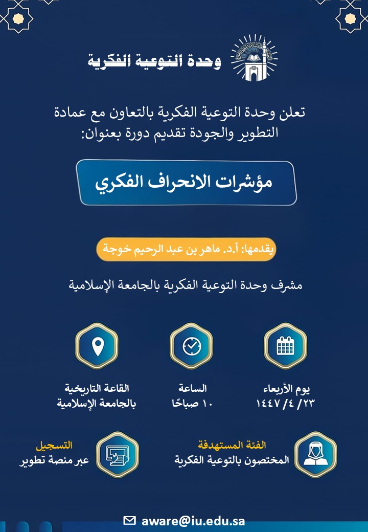 تعلن وحدة التوعية الفكرية عن إقامة ورشة تدريبية لمنسوبي الجامعة العاملين في برامج وأنشطة التوعية الفكرية بعنوان (مؤشرات الانحراف الفكري)