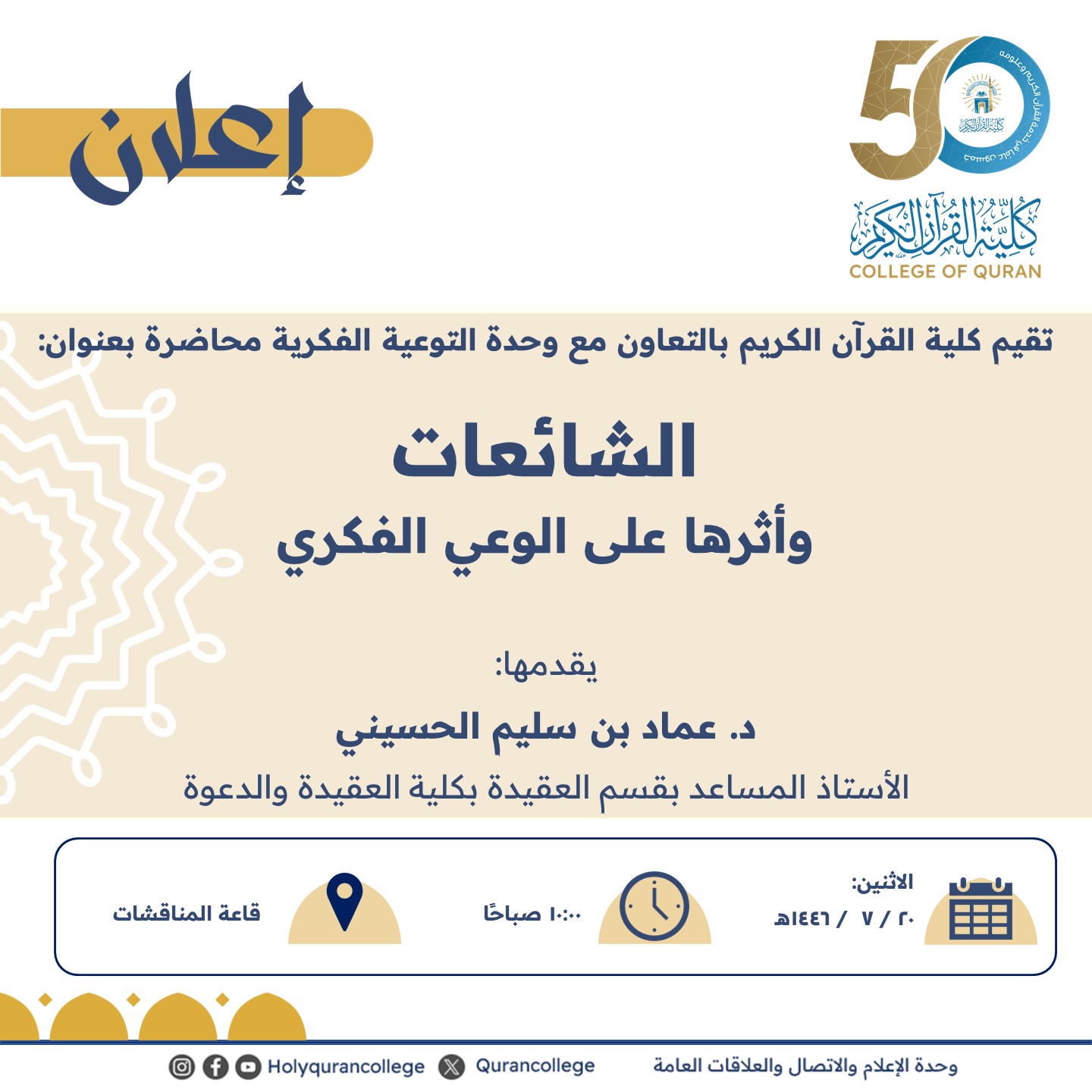 تقيم كلية القرآن الكريم بالتعاون مع وحدة التوعية الفكرية محاضرة بعنوان: الشائعات وأثرها على الوعي الفكري