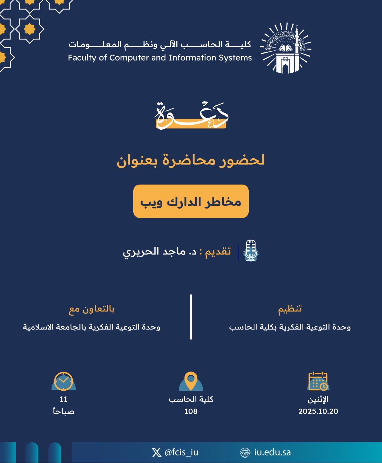 تنفيذ لقاء توعوي لطلاب كلية الحاسب الآلي بالتعاون مع وحدة التوعية الفكرية يوم الاثنين 28-ربيع الثاني-1447