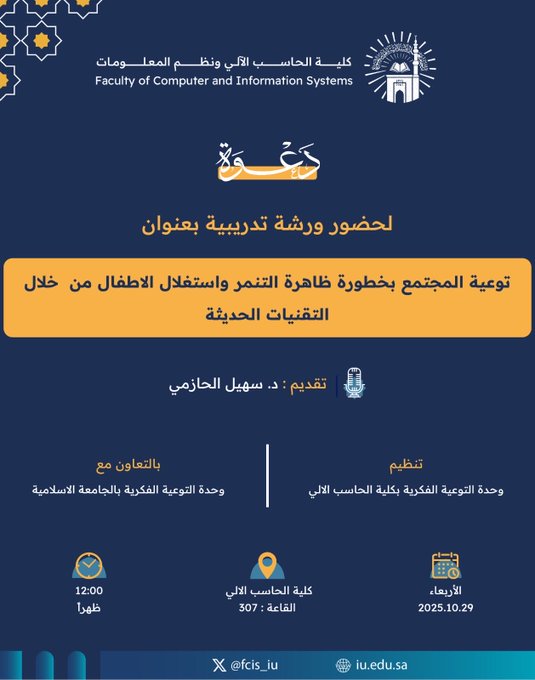 تنفيذ لقاء توعوي لطلاب كلية الحاسب الآلي بالتعاون مع وحدة التوعية الفكرية يوم الأربعاء 07-جمادى الأولى-1447