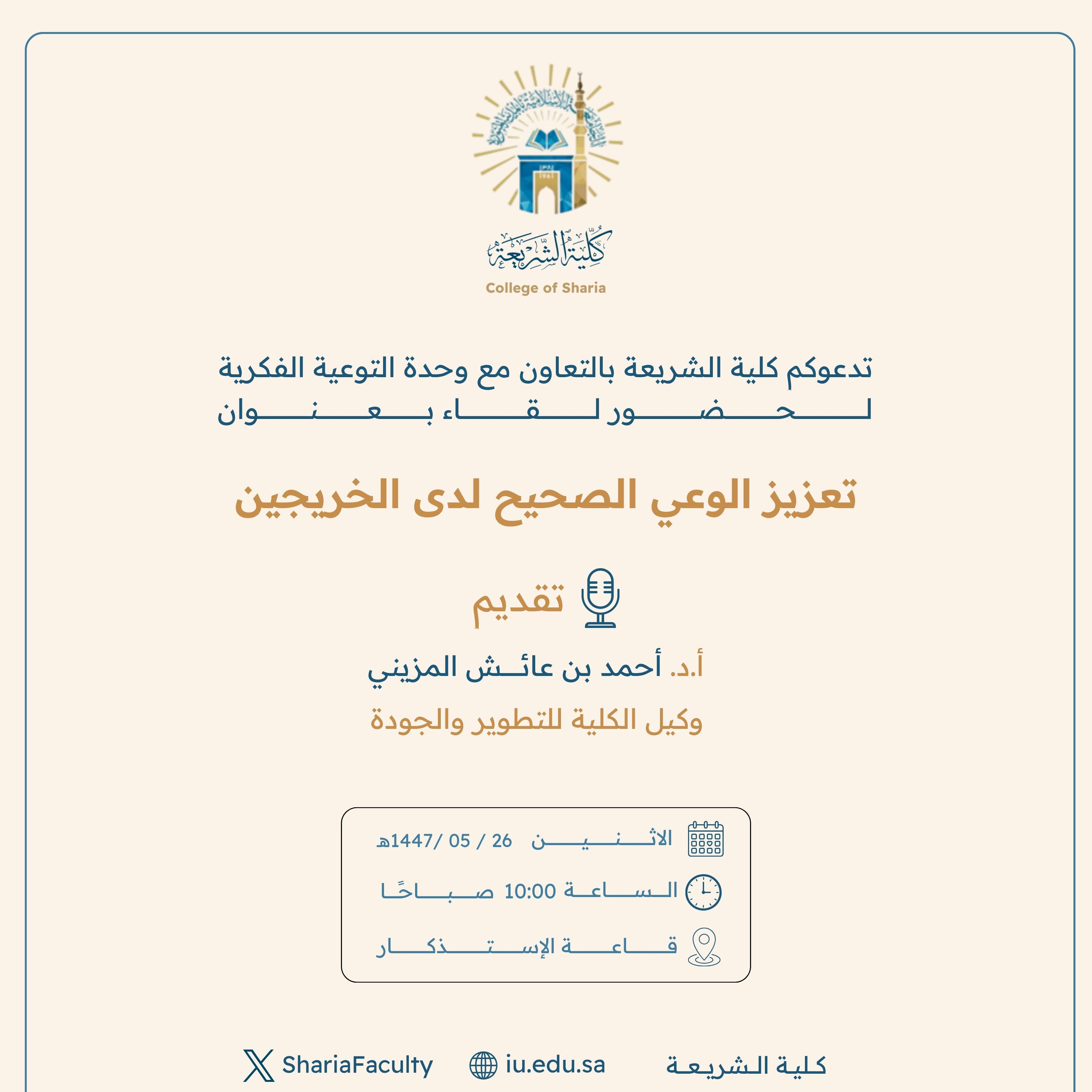 تنفيذ لقاء توعوي لطلاب كلية الشريعة بالتعاون مع وحدة التوعية الفكرية يوم الاثنين 19-جمادى الأولى-1447