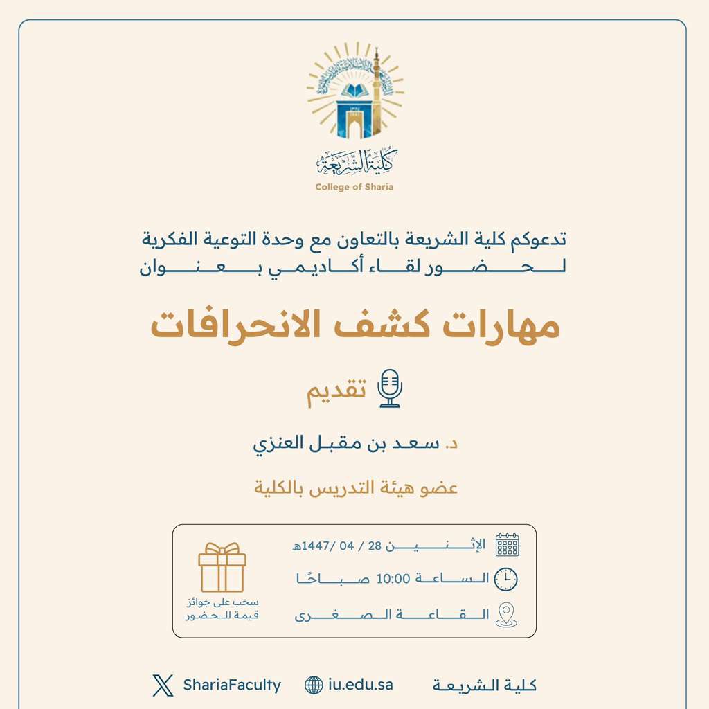 تنفيذ لقاء توعوي لطلاب كلية الشريعة بالتعاون مع وحدة التوعية الفكرية يوم الاثنين 28-ربيع الثاني-1447