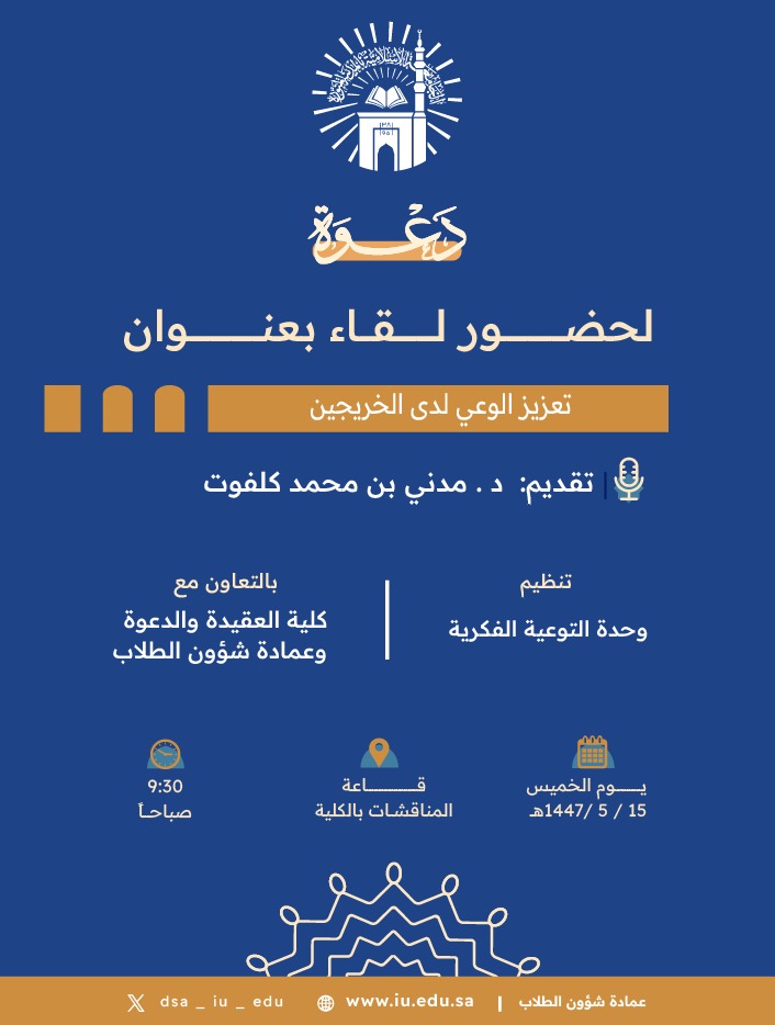 تنفيذ لقاء توعوي لطلاب كلية العقيدة والدعوة بالتعاون مع وحدة التوعية الفكرية يوم الخميس 15-جمادى الأولى-1447