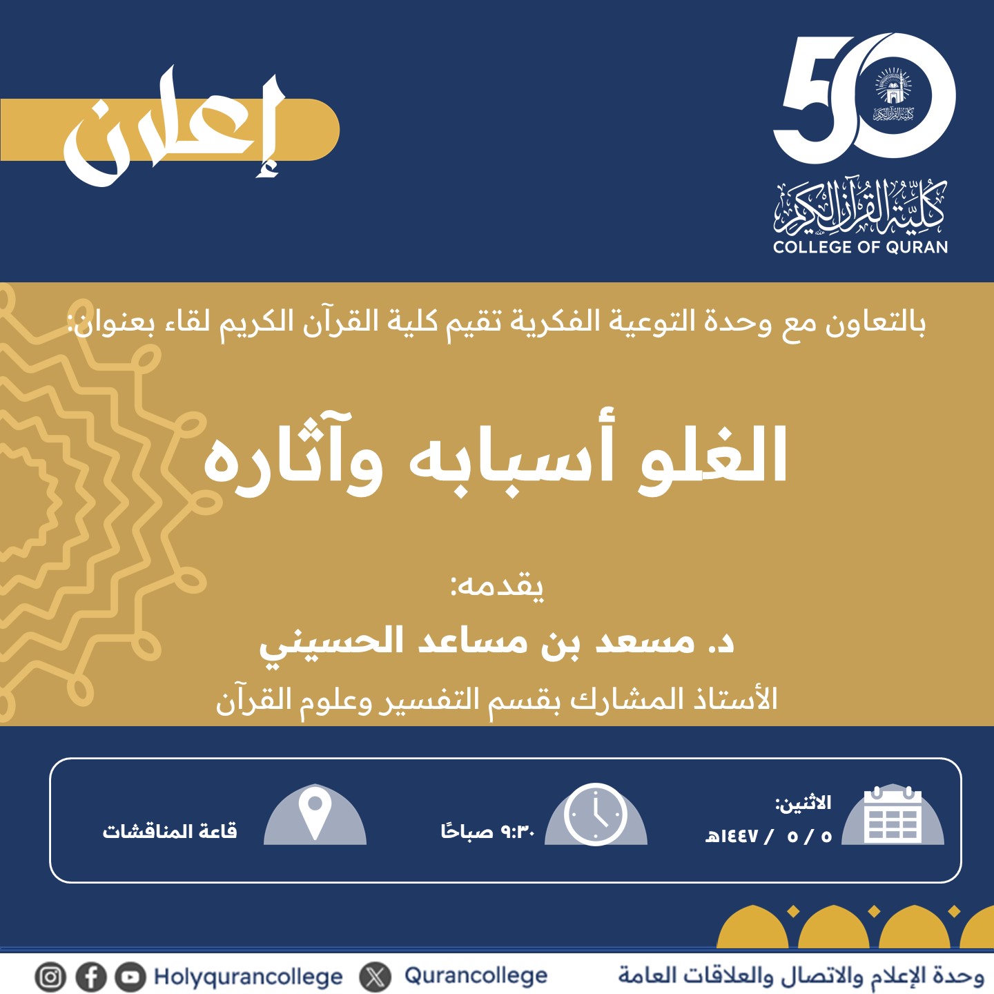 تنفيذ لقاء توعوي لطلاب كلية القرآن الكريم بالتعاون مع وحدة التوعية الفكرية يوم الاثنين 05-جمادى الأولى-1447