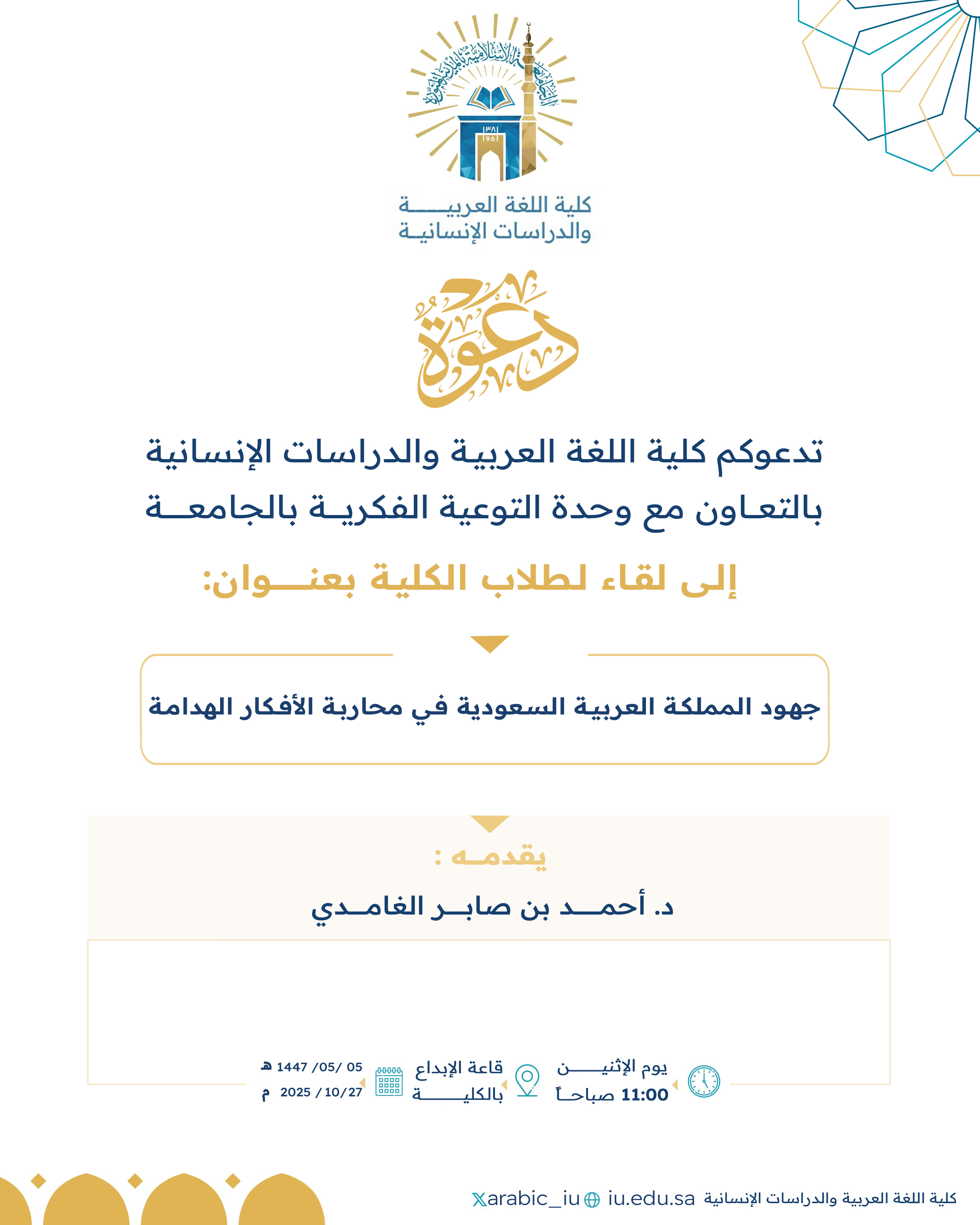 تنفيذ لقاء توعوي لطلاب كلية اللغة العربية بالتعاون مع وحدة التوعية الفكرية يوم الاثنين 05-جمادى الأولى-1447