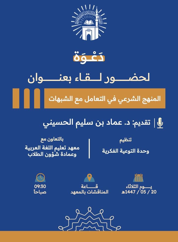 تنفيذ لقاء توعوي لطلاب معهد تعليم اللغة العربية بالتعاون مع وحدة التوعية الفكرية يوم الثلاثاء 20-جمادى الأولى-1447