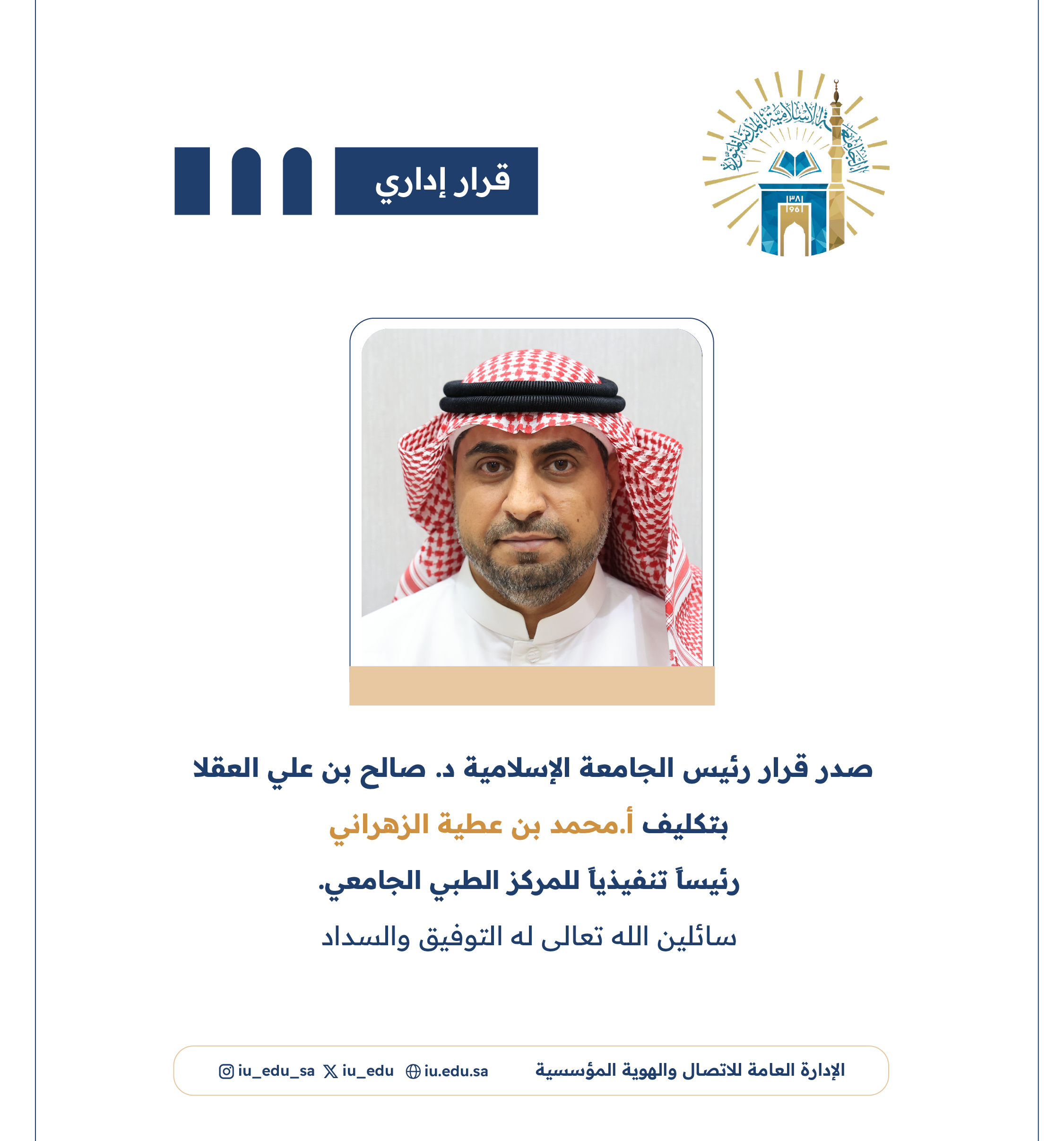 تهنئ الجامعة الإسلامية الأستاذ محمد بن عطيه الزهراني بمناسبة تكليفه رئيساً تنفيذياً للمركز الطبي.