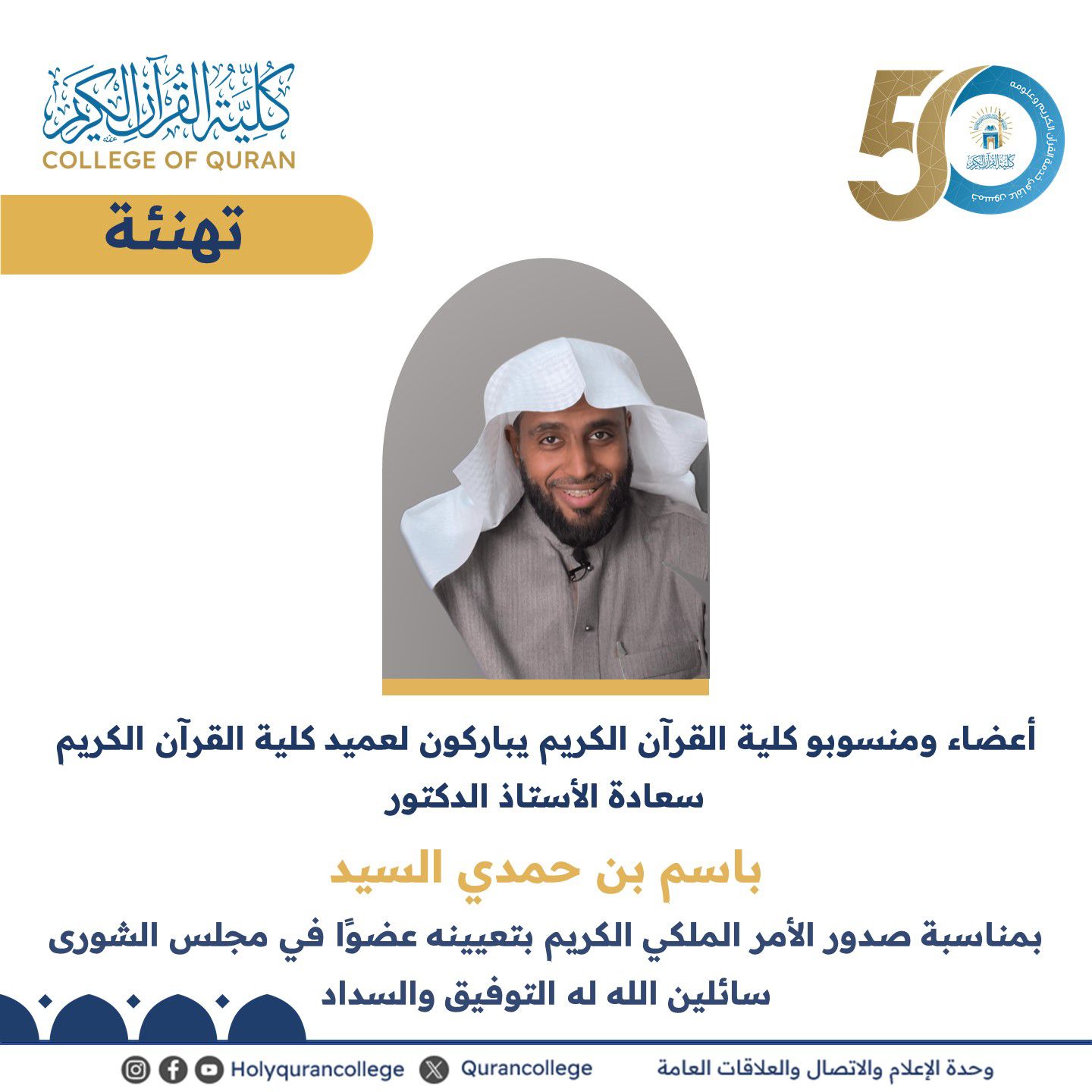 أعضاء ومنسوبو كلية القرآن الكريم يباركون لعميد كلية القرآن الكريم سعادة الأستاذ الدكتور/ باسم بن حمدي السيد بمناسبة صدور الأمر الملكي الكريم بتعيينه عضوًا في مجلس الشورى