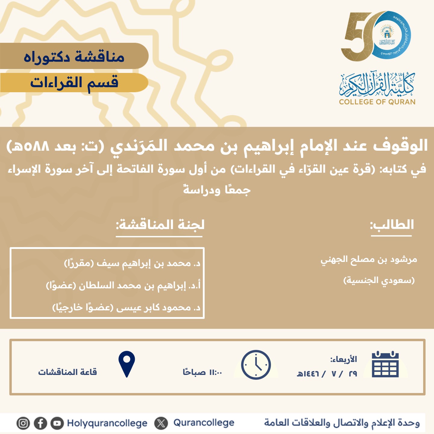 الوقوف عند الإمام إبراهيم بن محمد الـمَرَندي (ت: بعد 588هـ) في كتابه: (قرة عين القرّاء في القراءات) من أول سورة الفاتحة إلى آخر سورة الإسراء جمعًا ودراسةً