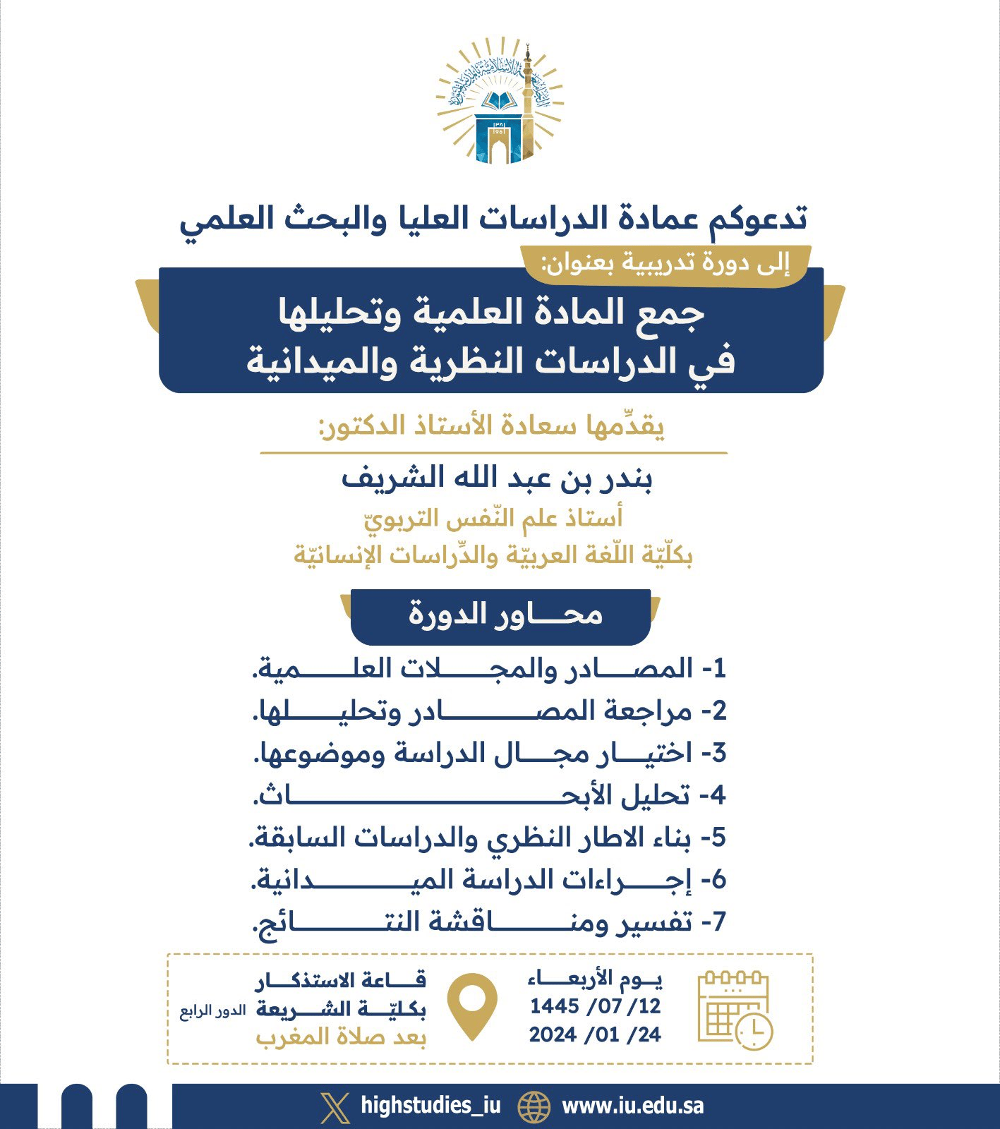 تعلن #عمادة_الدراسات_العليا_والبحث_العلمي بالتعاون مع #كلية_الشريعة عن تقديم دورة تدريبيّة بعنوان(جمع المادة العلميّة وتحليلها في الدراسات النظريّة والميدانيّة)