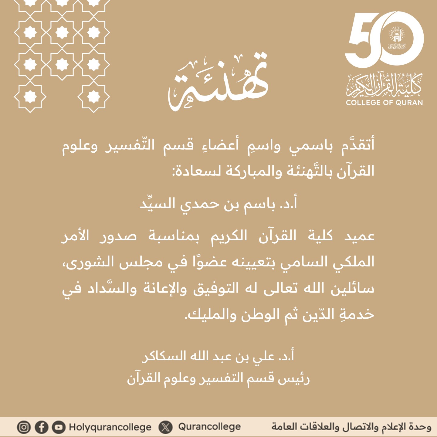يتقدم رئيس قسم التفسير وعلوم القرآن أ.د. علي بن عبد الله السكاكر باسمه واسمِ أعضاءِ مجلس قسم التّفسير وعلوم القرآن بالتَّهنئة والمباركة لسعادة الأستاذ الدكتور باسم بن حمدي السيِّد عميد كلية القرآن الكريم بمناسبة صدور الإرادة الملكية السامية بتعيينه عضوًا في مجلس الشورى، سائلين الله تعالى له التوفيق والإعانة والسَّداد في خدمةِ الدّين والوطن والمليك.