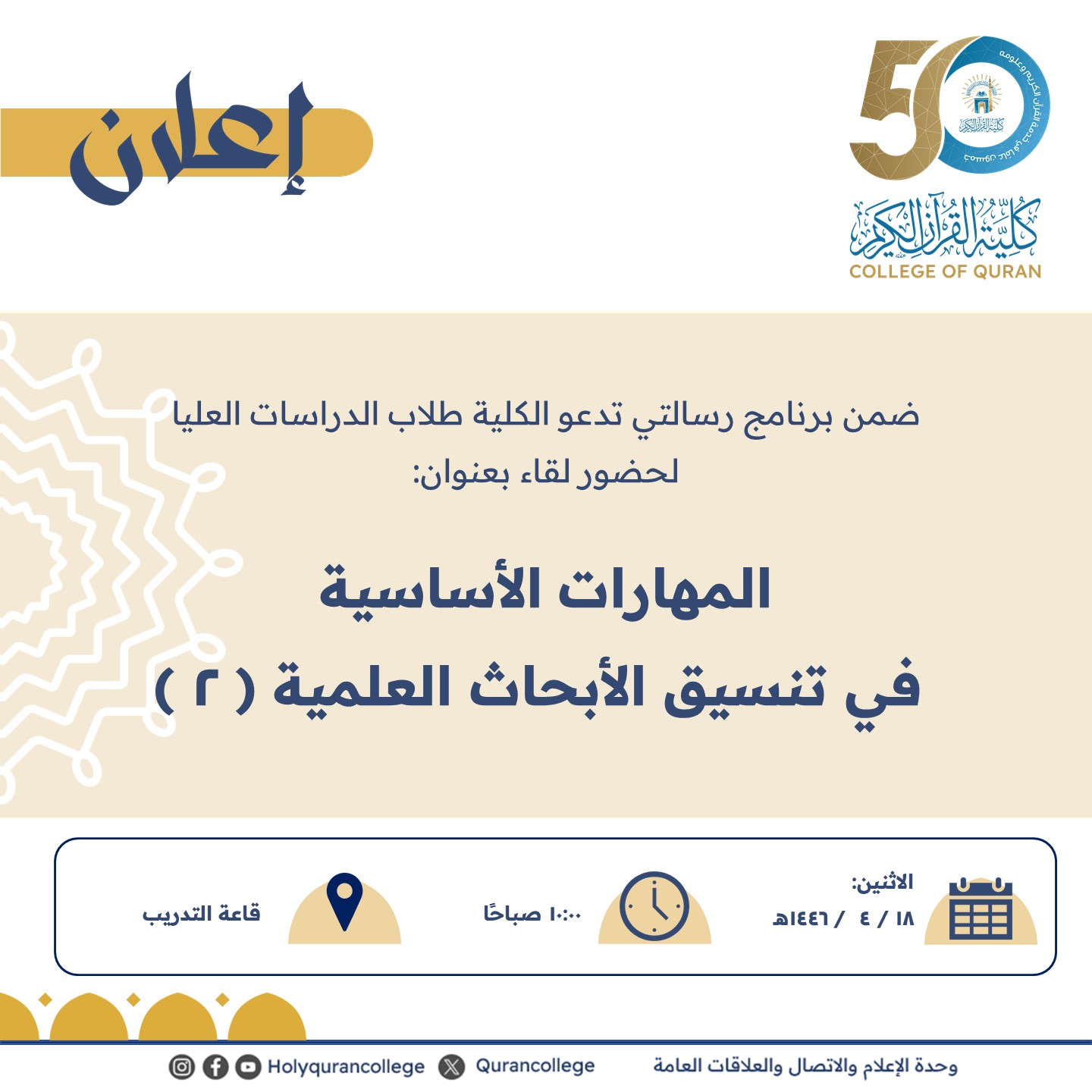 ضمن برنامج رسالتي تدعو الكلية طلاب الدراسات العليا لحضور لقاء بعنوان: المهارات الأساسية في تنسيق الأبحاث العلمية ( 2 )