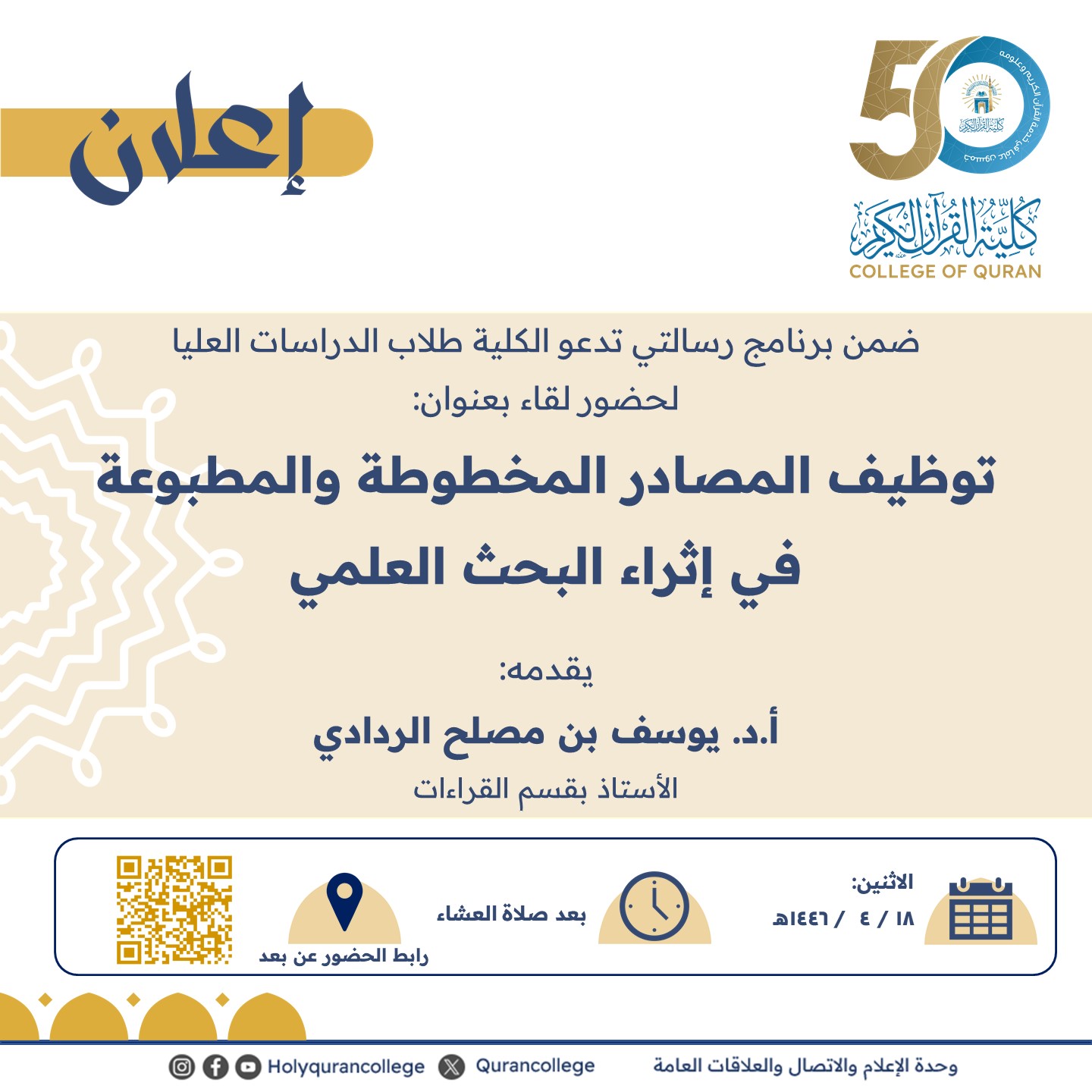 ضمن برنامج رسالتي تدعو الكلية طلاب الدراسات العليا لحضور لقاء بعنوان: توظيف المصادر المخطوطة والمطبوعة في إثراء البحث العلمي