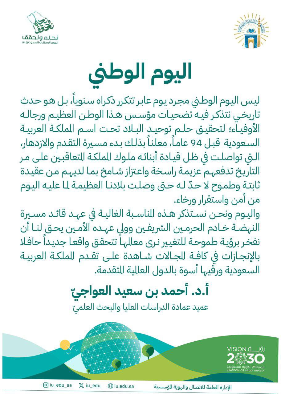 كلمة سعادة عميد عمادة الدراسات العليا والبحث العلمي بـالجامعة الإسلامية أ.د. أحمد بن سعيد العواجيّ بمناسبة اليوم الوطني السعودي94 نحلم ونحقق