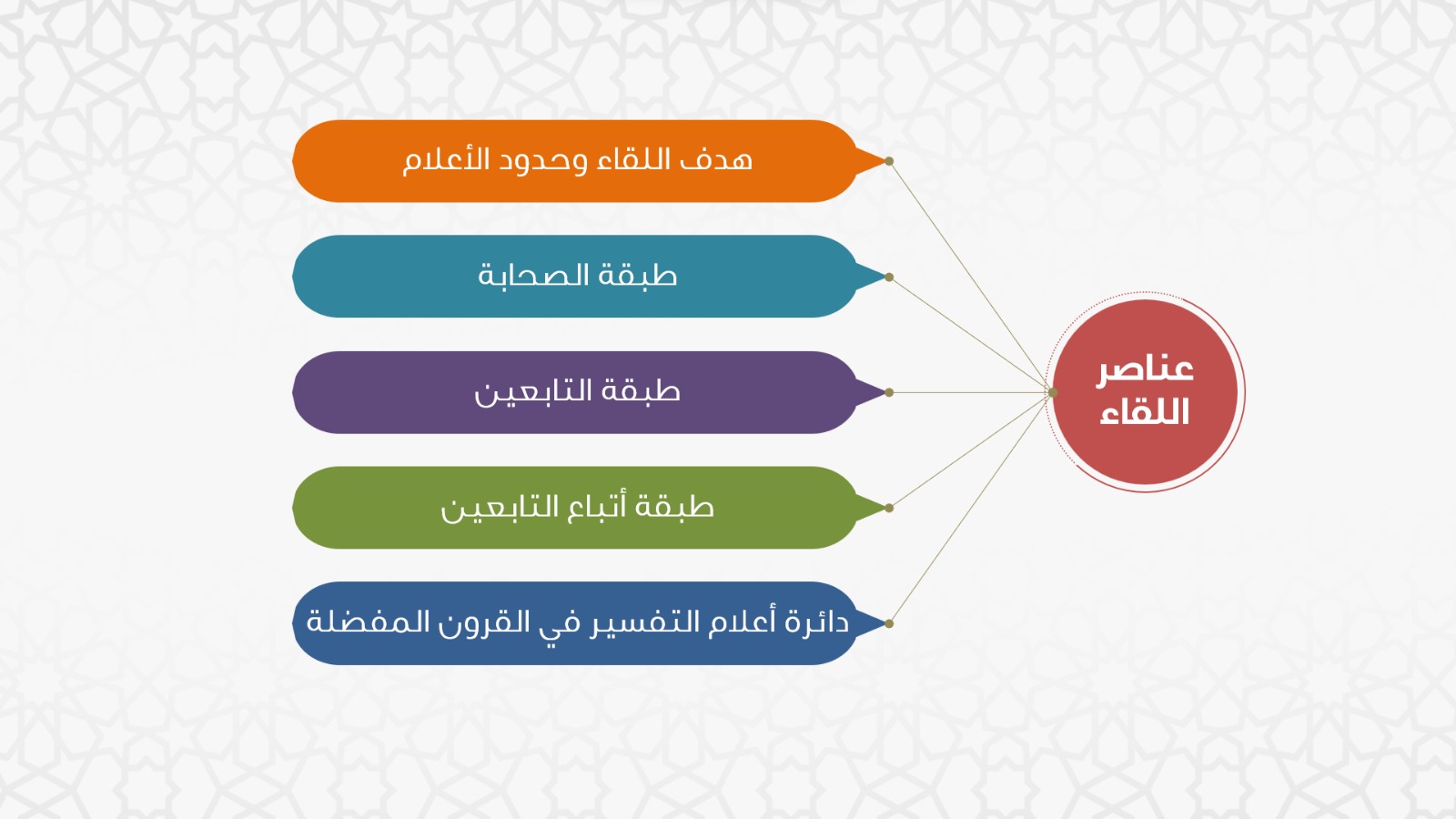 وافتتح اللقاء بترحيب من سعادته بالحضور وشكرهم على اهتمامهم وحرصهم على الحضور، وعرف بمقدمة عن أعلام التفسير، ثم شرع في بيان طبقات التفسير في القرون المفضلة طبقة تلو أخرى، مع إيضاح وجوه الاتصال فيها، وختم اللقاء بعرض موجز عن نتائج الاتصال بين أعلام التفسير.