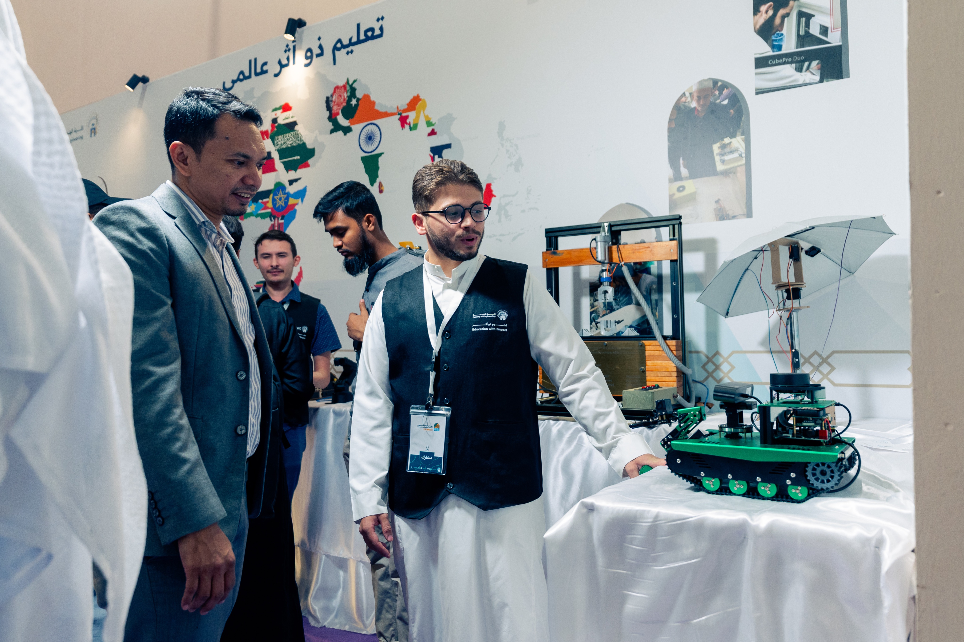 طلاب كلية الهندسة في الجامعة الإسلامية يستعرضون إنجازاتهم وابتكاراتهم في الميكانيكا والكهرباء والهندسة المدنية والذكاء الاصطناعي، ضمن مشاركتهم في مهرجان الثقافات والشعوب الثالث عشر.