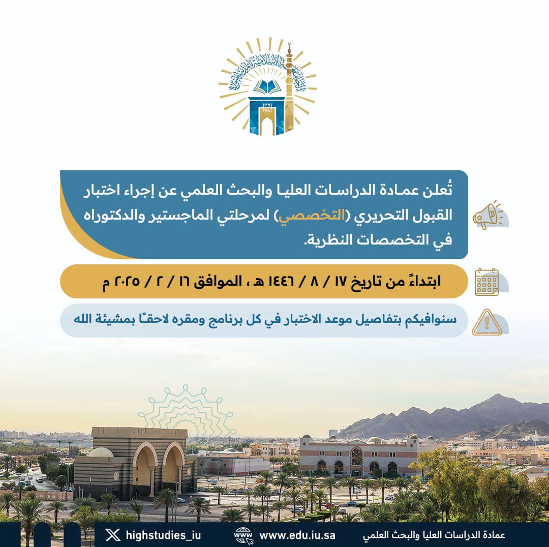 تعلن عمادة الدراسات العليا والبحث العلمي موعد اختبار القبول للتخصصات النظرية لعام 1447هـ