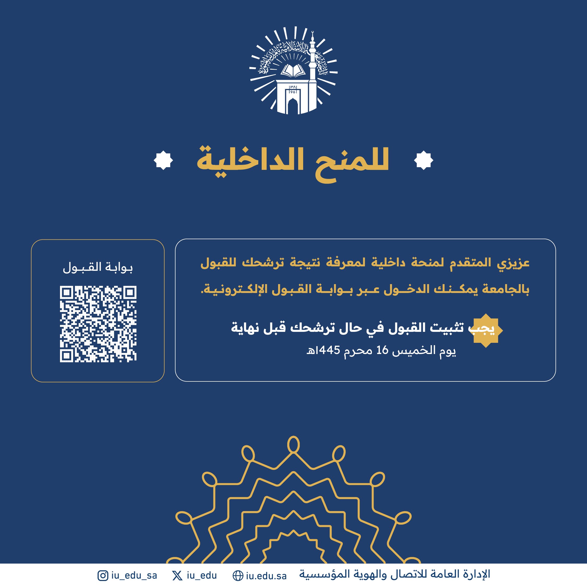 وفي حال تم ترشيحك للقبول، الرجاء المبادرة بتثبيت القبول قبل نهاية يوم الخميس 16 محرم 1445هـ.