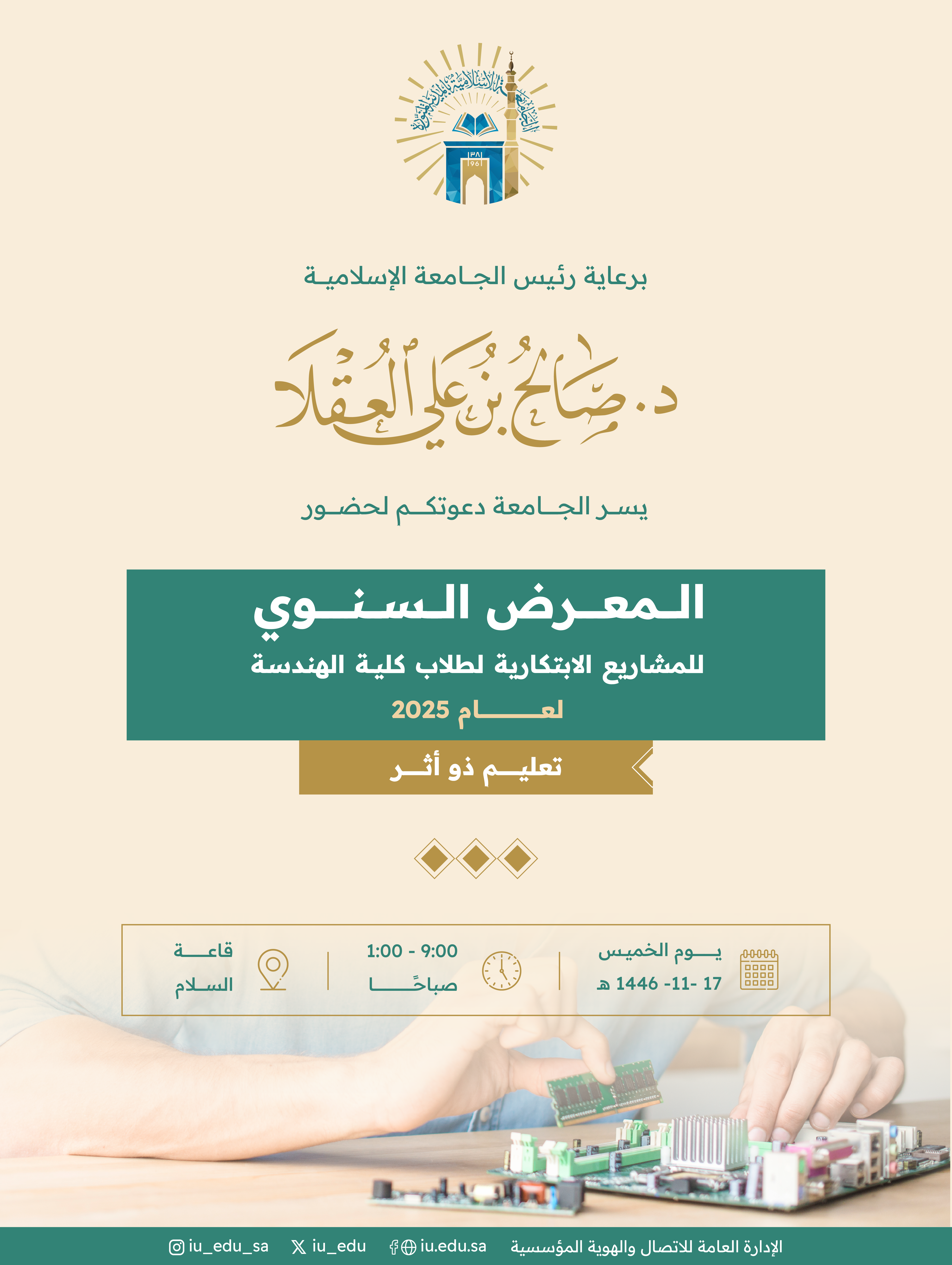 يسرّ الجامعة دعوتكم لحضور المعرض السنوي للمشاريع الابتكارية لطلاب كلية الهندسة لعام ٢٠٢٥م، “تعليم ذو أثر”، وذلك يوم غدٍ الخميس 17 ذو القعدة 1446هـ، في قاعة السلام بالمدينة الجامعية.