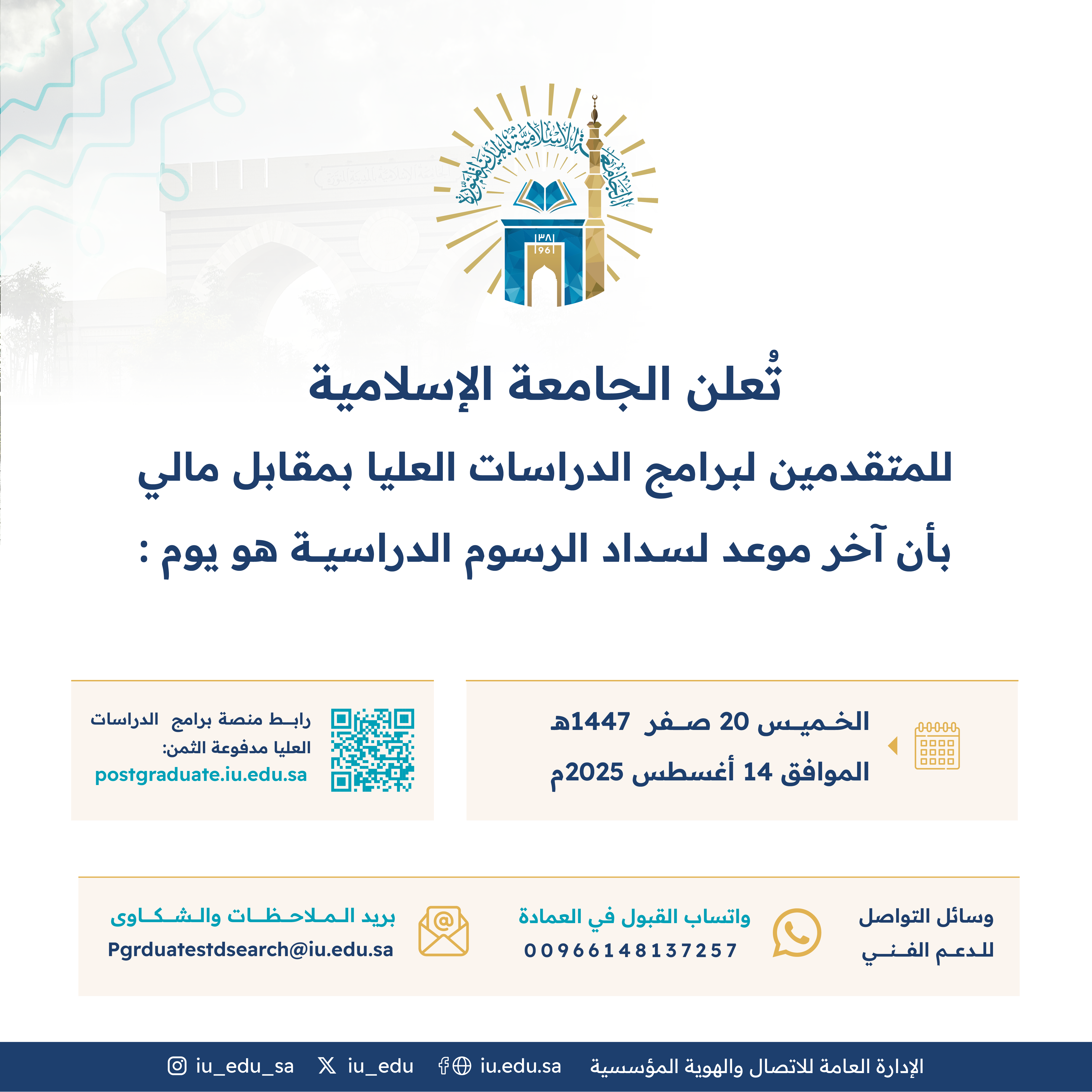 تعلن الجامعة الإسلامية للمتقدمين لبرامج الدراسات العليا بمقابل مالي بأن آخر موعد لسداد الرسوم الدراسية هو يوم الخميس 20 صفر 1447هـ الموافق 14 أغسطس 2025م، عن طريق أيقونة السداد المتاحة في بوابة القبول الإلكترونية من خلال الرابط: