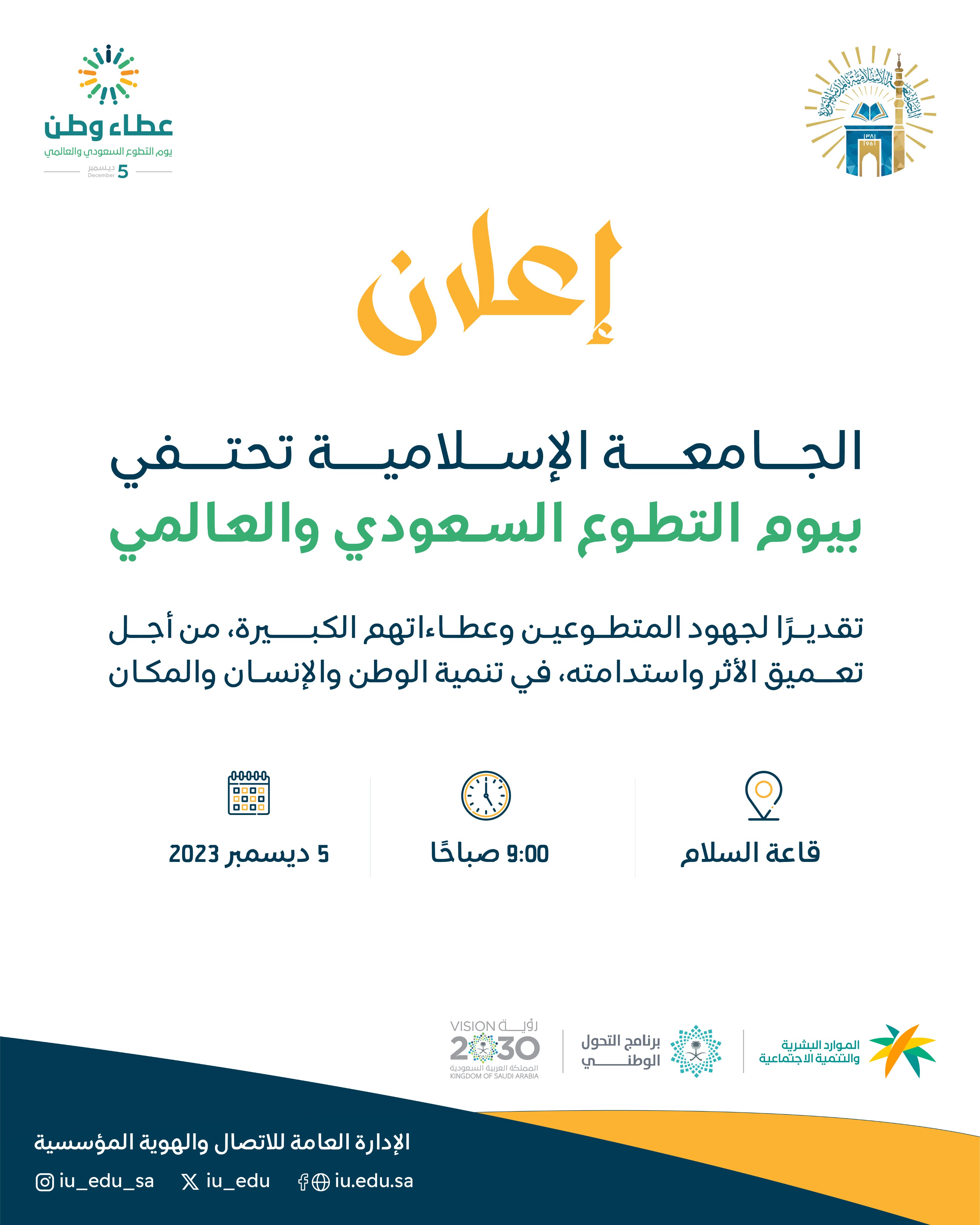 الجامعة الإسلامية تحتفي بالمتطوعين في يومهم العالمي؛ تقديرًا لجهودهم وعطاءاتهم الكبيرة.