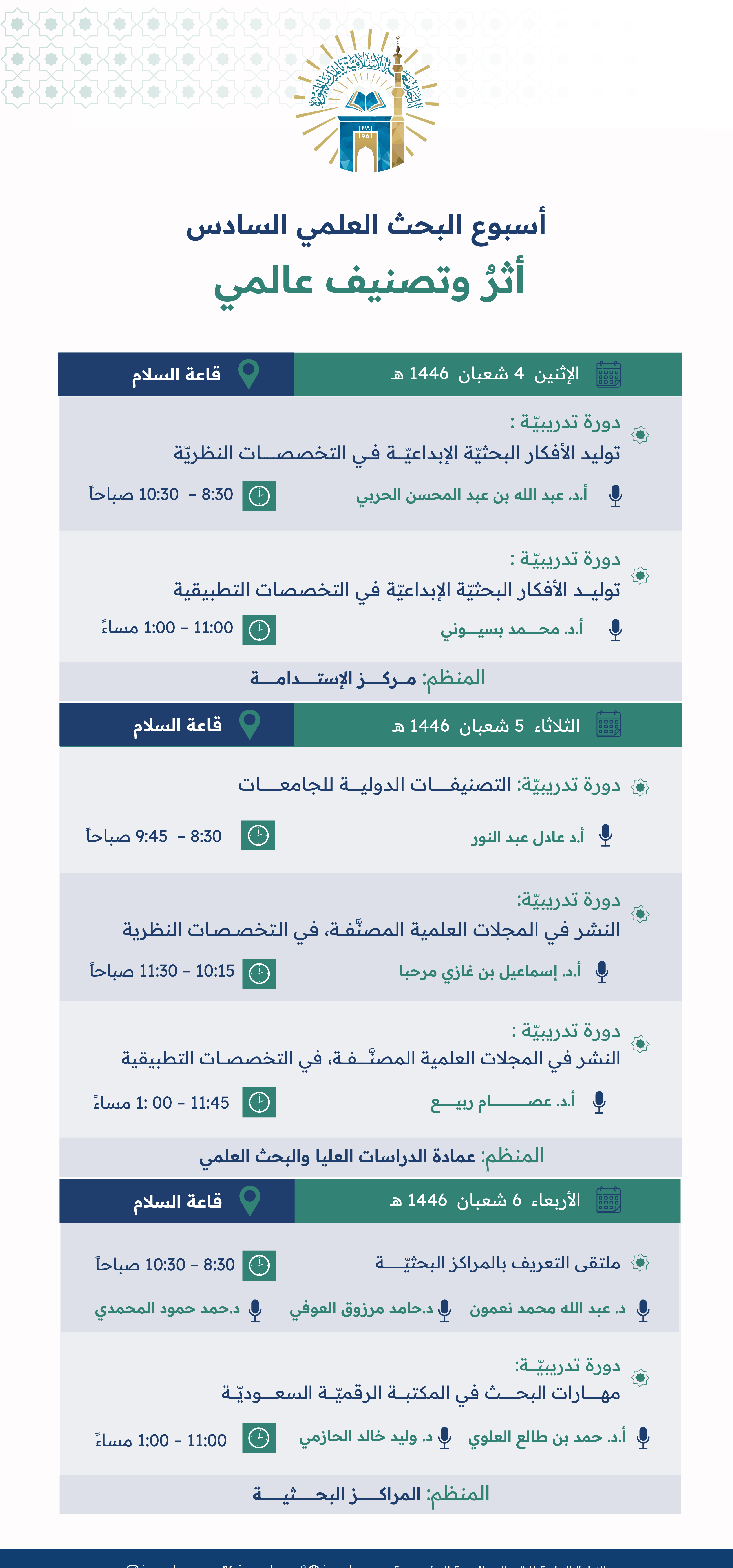 تقدّم الجامعة الإسلامية خلال أسبوع البحث العلمي السادس، تحت شعار (أثرُ وتصنيف عالميّ)، العديد من الفعاليات والدورات التدريبية التي تهدف إلى دعم الأولويات البحثية.
