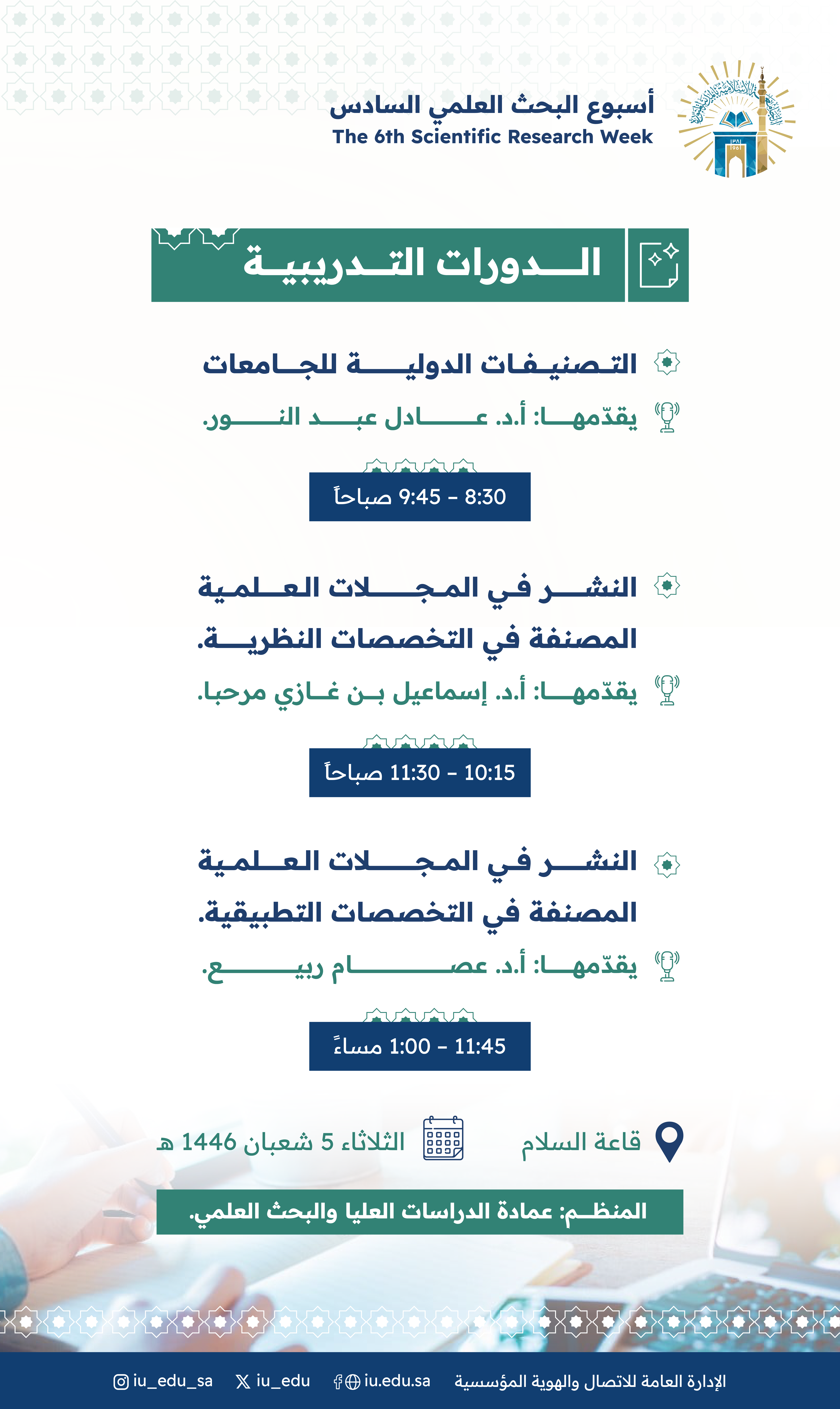 تُعلن الجامعة الإسلامية، ممثلةً في عمادة الدراسات العليا والبحث العلمي، عن تقديم دورات تدريبية نوعية ومتنوعة، وذلك يوم غدٍ الثلاثاء الموافق 5 شعبان 1446هـ، ضمن فعاليات أسبوع البحث العلمي السادس.
